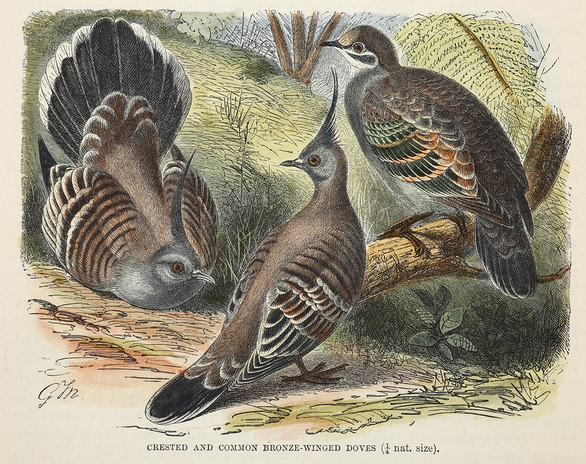 Scarce c.19th hand coloured engraving of Australian doves. Common name: Crested pigeon Binomial name: Ocyphaps lophotes First described: Temminck, 1822 Common name: Common bronzewing Binomial name: Phaps chalcoptera First described: Latham 1790 References: Nissen, C. Die zoologische Buchillustration. 1969 Hamburg: … Read Full Description