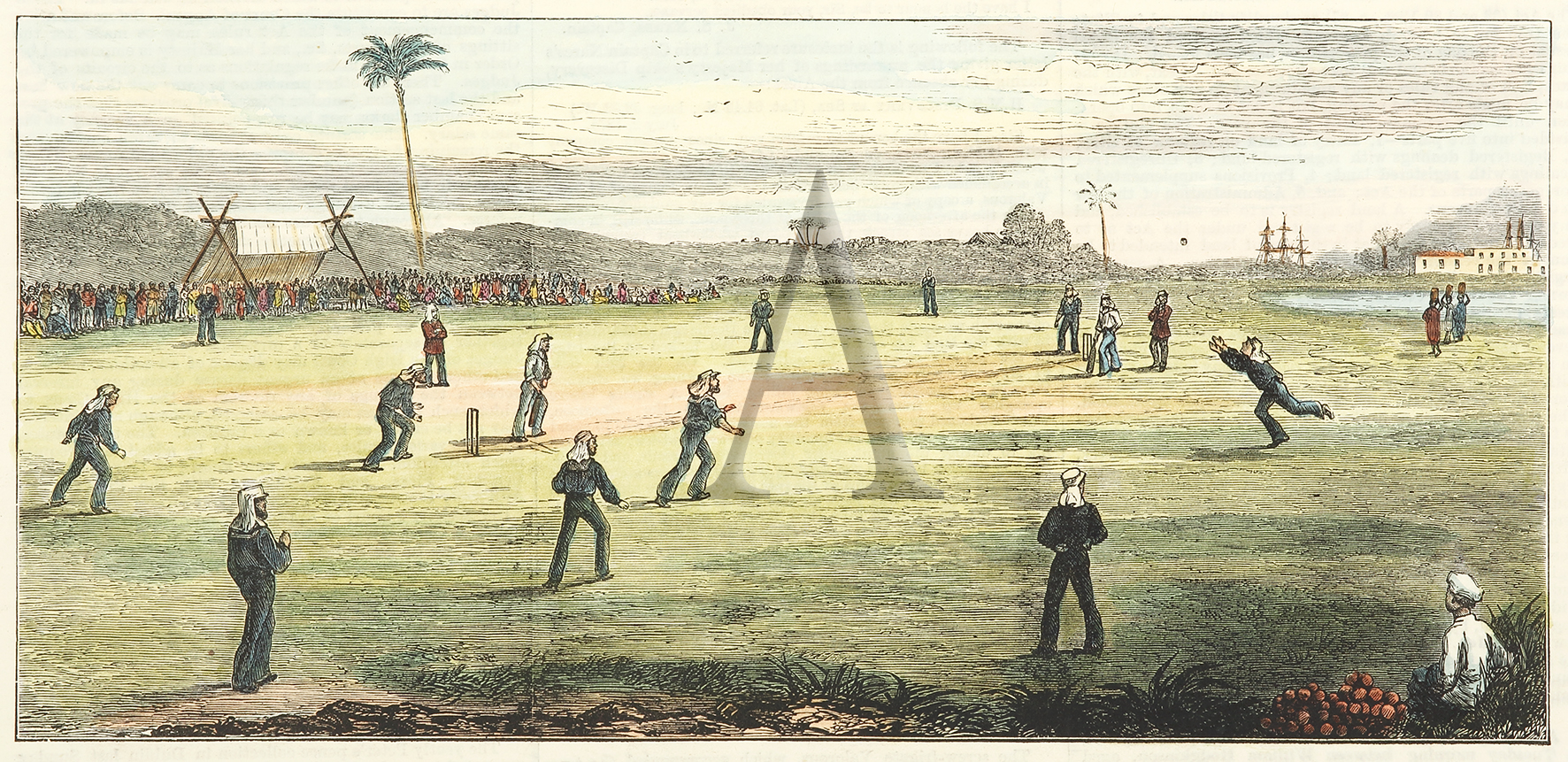 Early cricket engraving of cricket match been played at Zanzibar, on the island of Unguja on Africa’s east coast. From the original edition of the Illustrated London News.