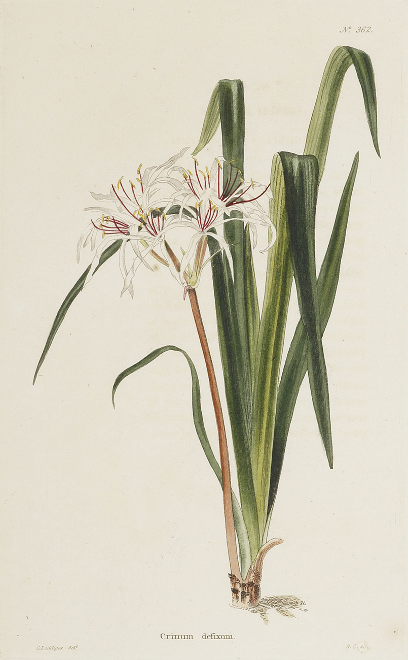Fine early c.19th botanical engraving of the River Crinum lily by Conrad Loddiges, The Botanical Cabinet, which was published from 1817 to 1822.