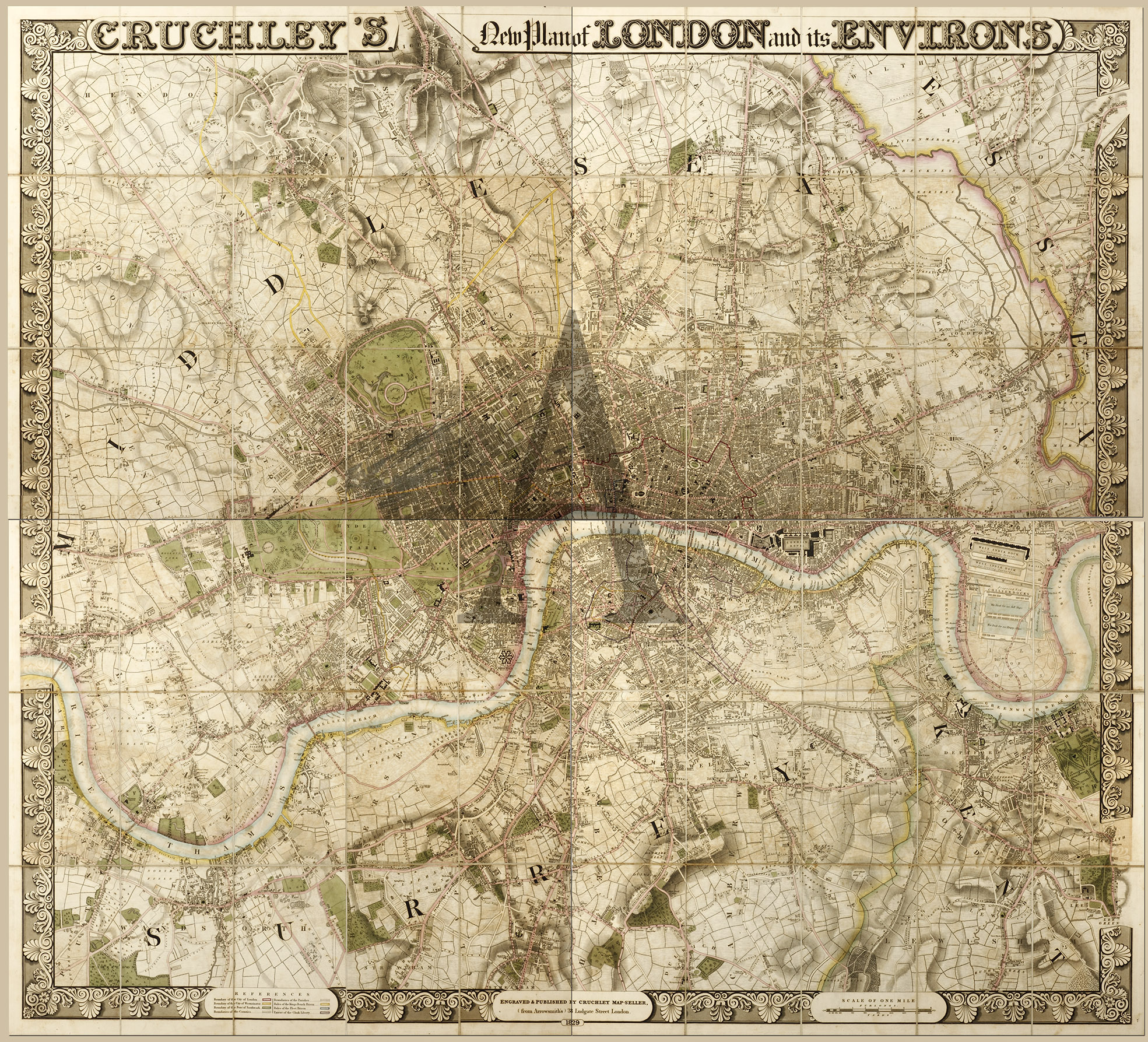 The second issue (first 1828) of this fine and detailed large plan of London dated 1829, dissected into sixty sections and laid onto linen in original slip case. Superb engraved frame border and colour key at lower left.