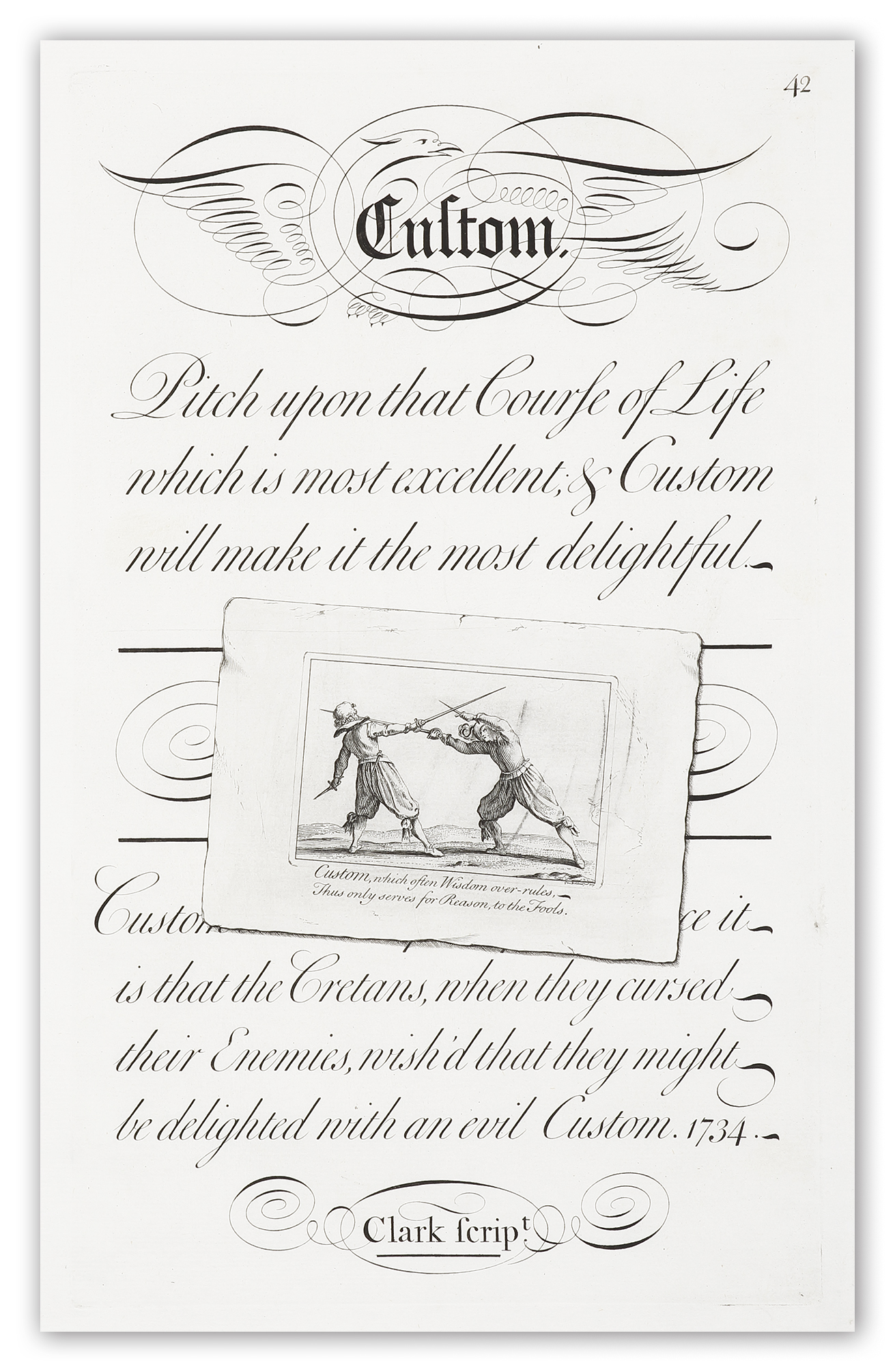 Appearing in Bickham’s Universal Penman was this poem by writing master Samuel Vaux, dated 1734, conveying, that poor writing was a disgrace to the beauty of the writer: “An artless Scrawl ye blushing Scribler shames; All shou’d be fair that Beauteous Woman frames.” And then this piece, hinting, that calligraphy may have a role in encouraging romance: “Strive to excel, with Ease the Pen will move; And pretty line add Charms to infant Love.” (Monaghan, 2005, p. 281).