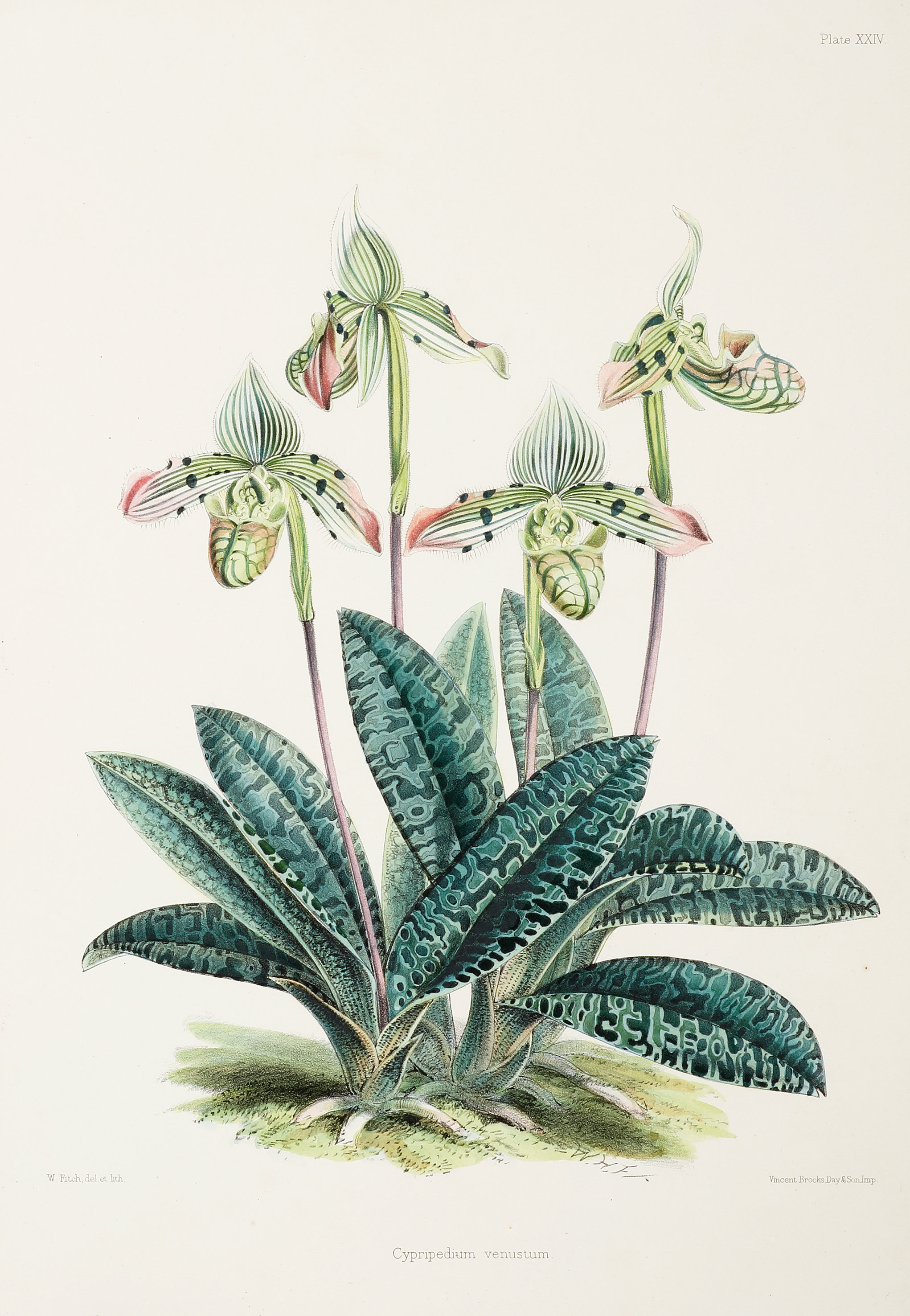 Rare folio sized orchid lithograph by Walter Fitch from the very rare series by Robert Warner, Select Orchidaceous Plants. Reference: Great Flower Books p.149 Common name The Charming Paphiopedilum, Venus slipperModern binomial name Paphiopedilum venustum First described … Read Full Description