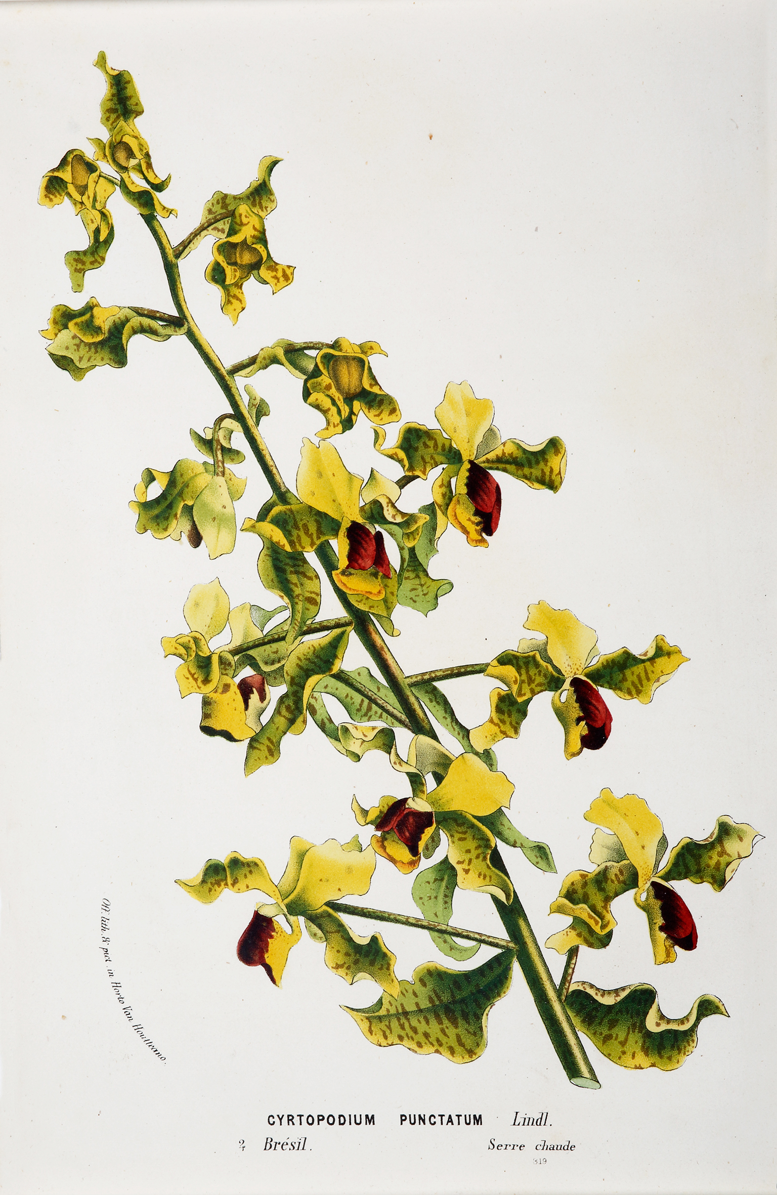 Stunning exotic botanical from Louis van Houtte’s, Flore des Serres et des Jardins de l’Europe (Flowers of the Greenhouses and Gardens of Europe). Common Name: Cowhorn Orchid Distribution: Florida , Mexico Argentina and Brasil