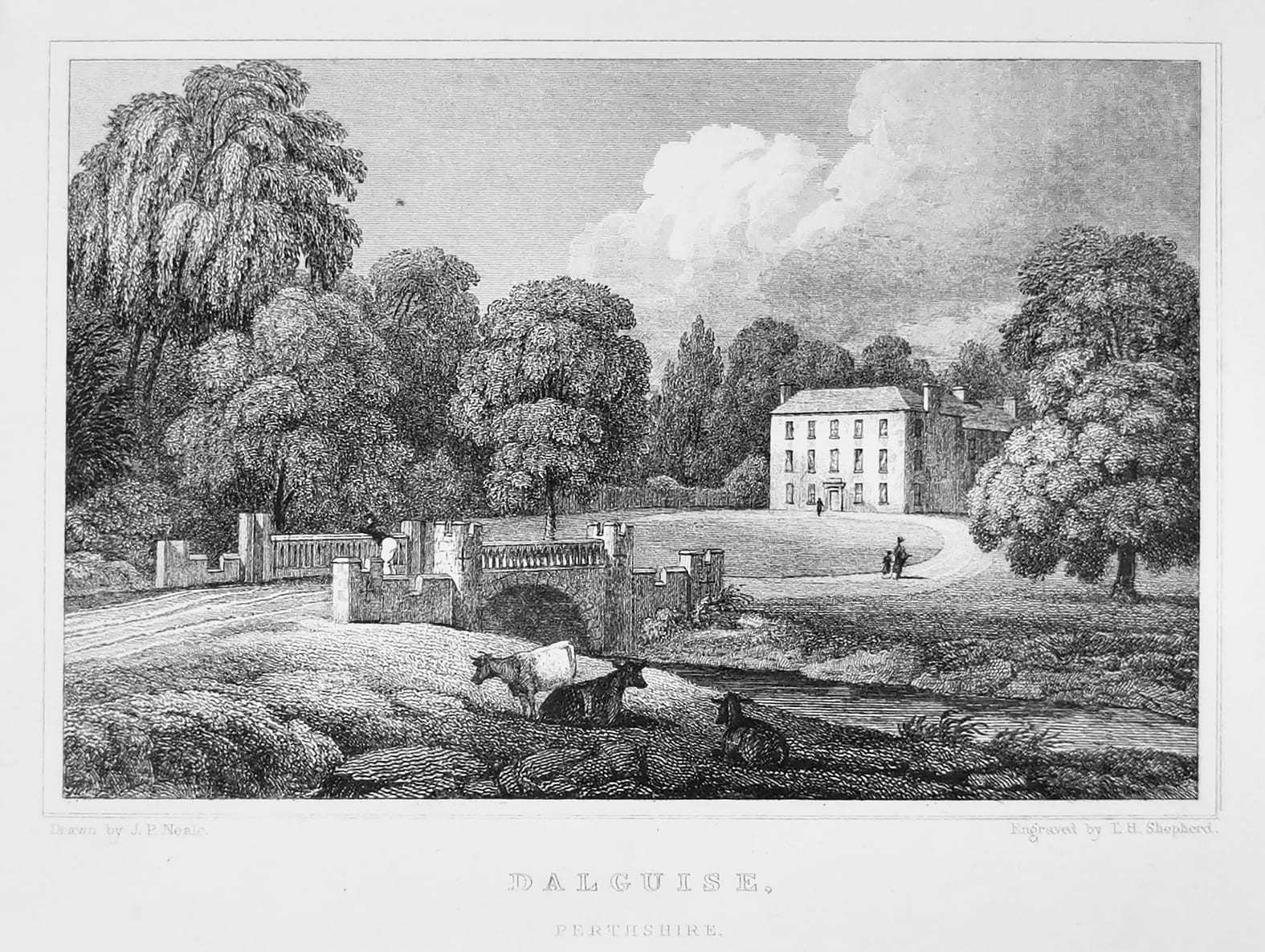 Early engraved view of Dalguise, a settlement in Perth and Kinross, central Scotland. From Shepherd’s, Modern Athens, Displayed in a Series of Views, or of Edinburgh in the Nineteenth Century.