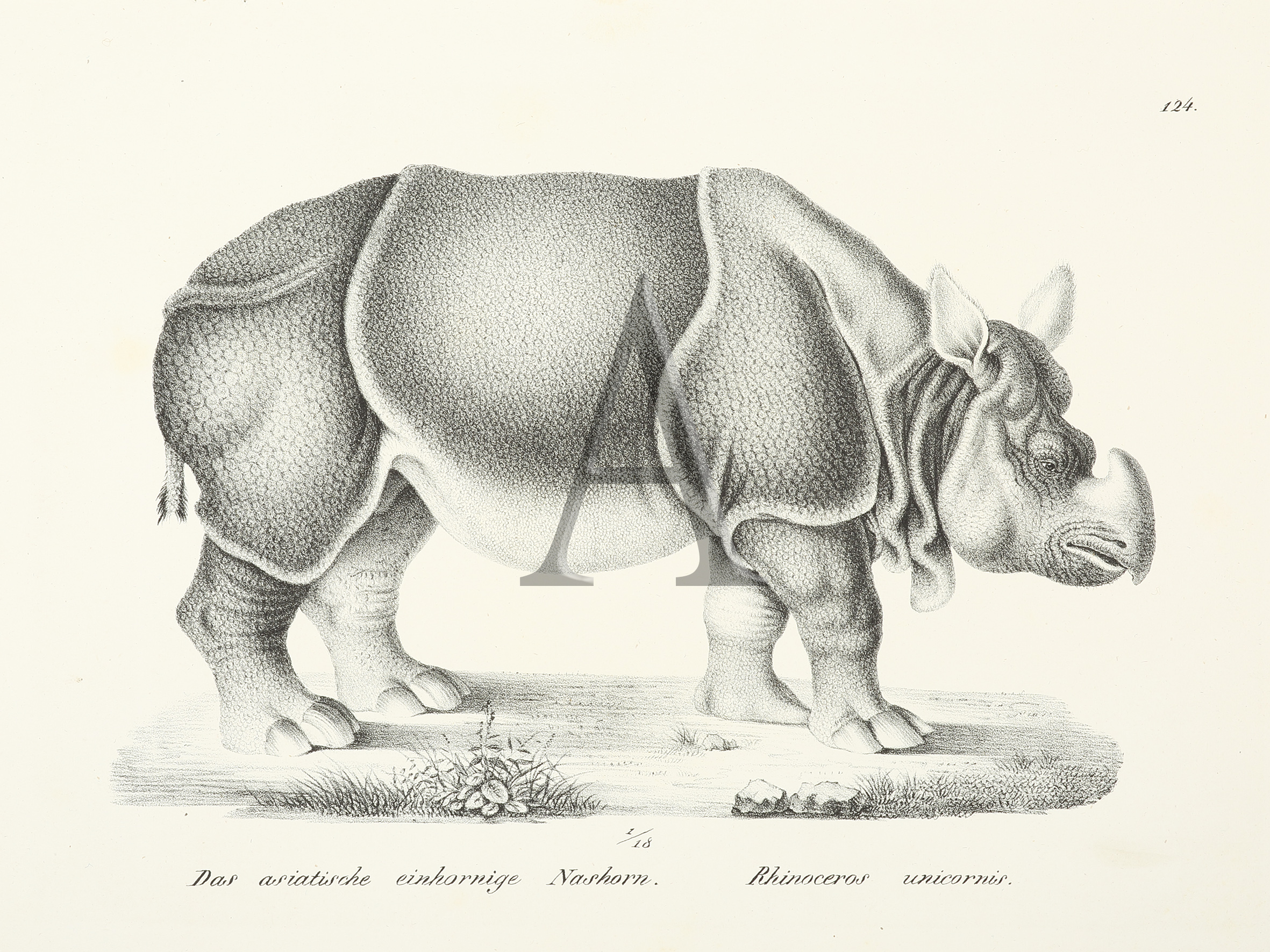 Famous c.19th image of a Rhinoceros by Karl Brodtmann. From: Schintz, R. Naturhistorische Abbildungen der Saeugethiere