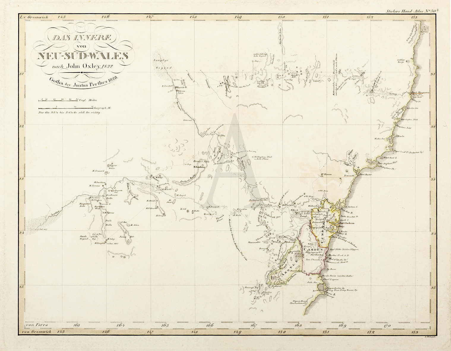 Early German map of New South Wales based on John Oxley’s exploration and surveys. Three counties named.