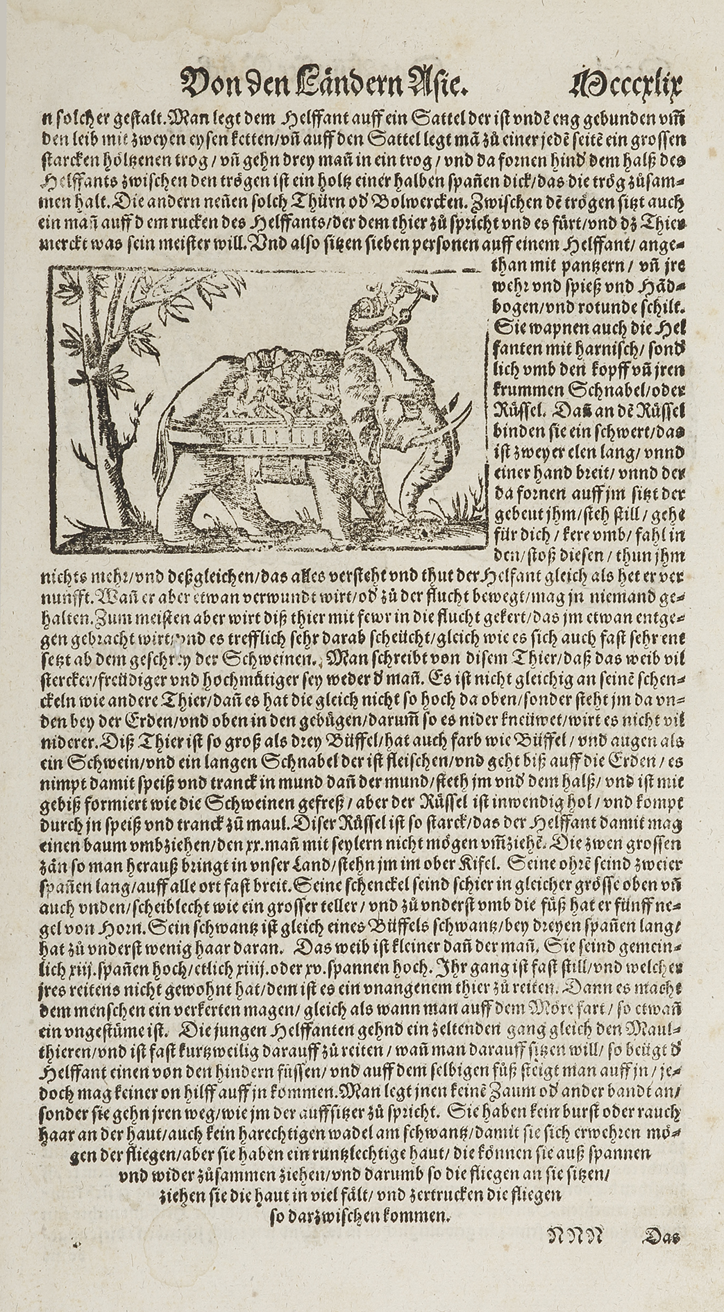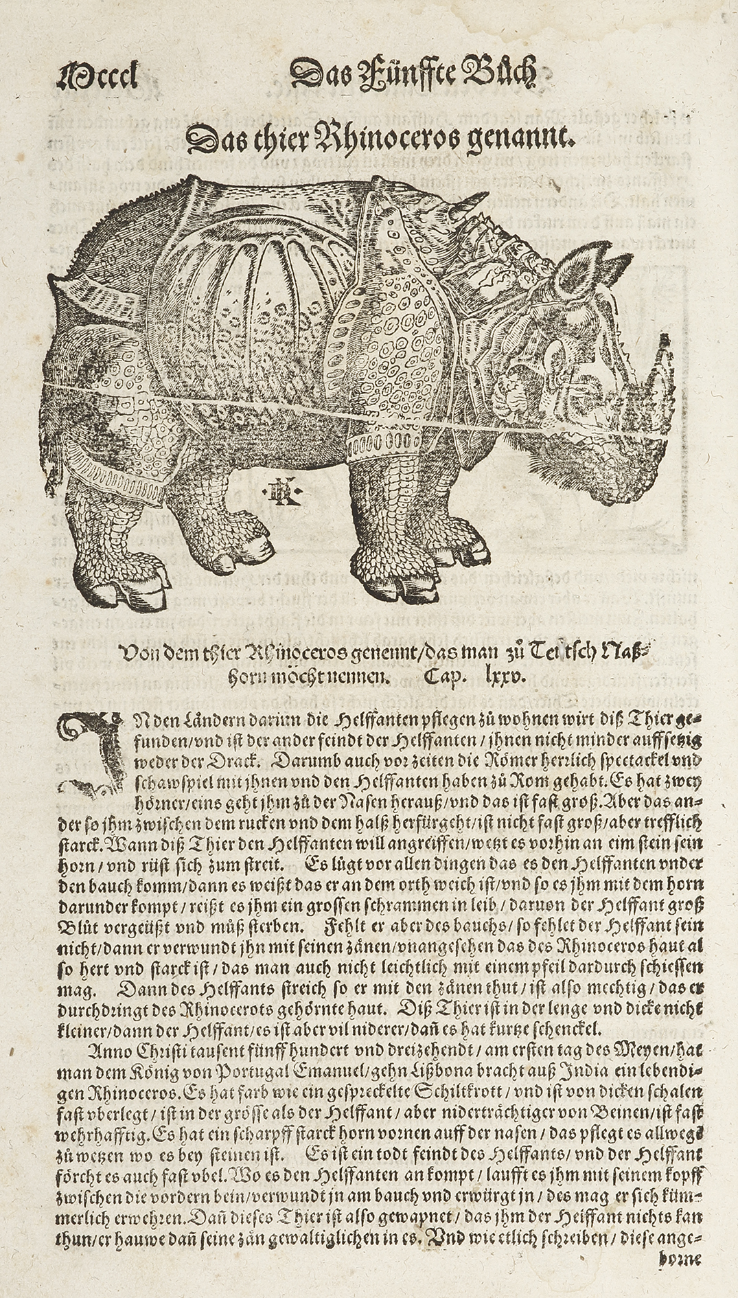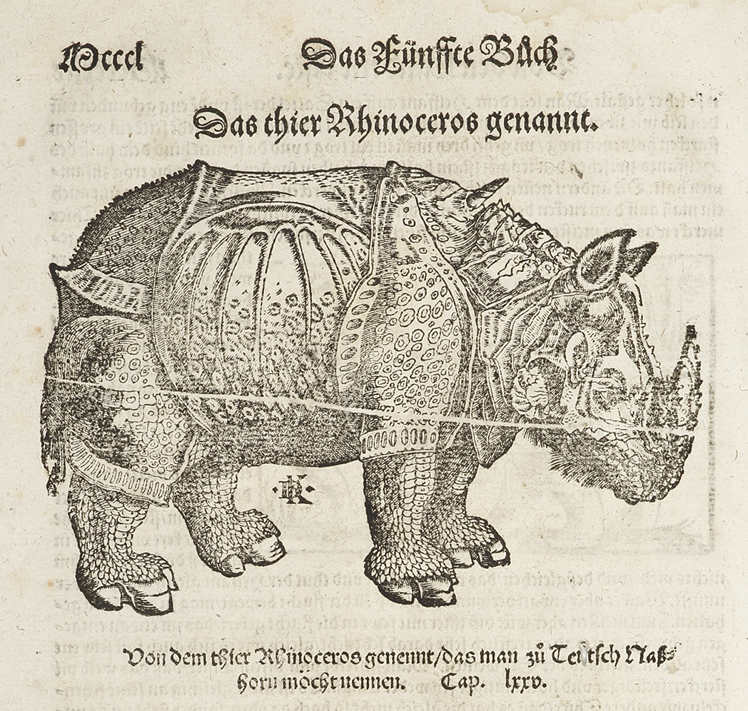 Famous woodcut after Albrecht Dürer (1471–1528) from Sebastian Munster’s, Geographia and with the initials of the engraver, ‘DK‘, David Kandel. This rhinoceros was the first seen in Europe in modern times. It was a gift from King Muzafar of Cambodia … Read Full Description