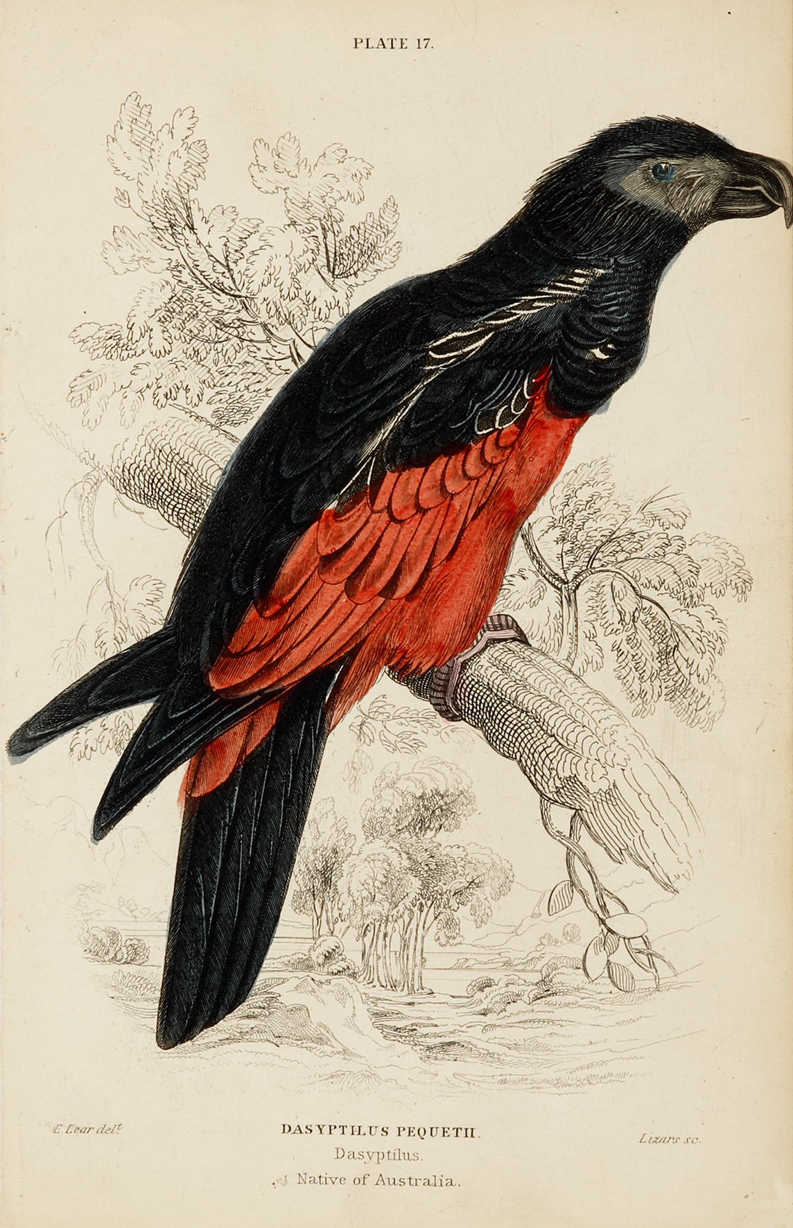 C19th engraving of the Pesquet’s parrot.  Although noted as native of Australia below the title this parrot is endemic to New Guinea. From the Naturalist Library. Common names: Pesquet’s parrot, Devil’s Parrot or Vulturine Parrot  Modern binomial name: Psittrichas fulgidus First described: Lesson 1830 … Read Full Description