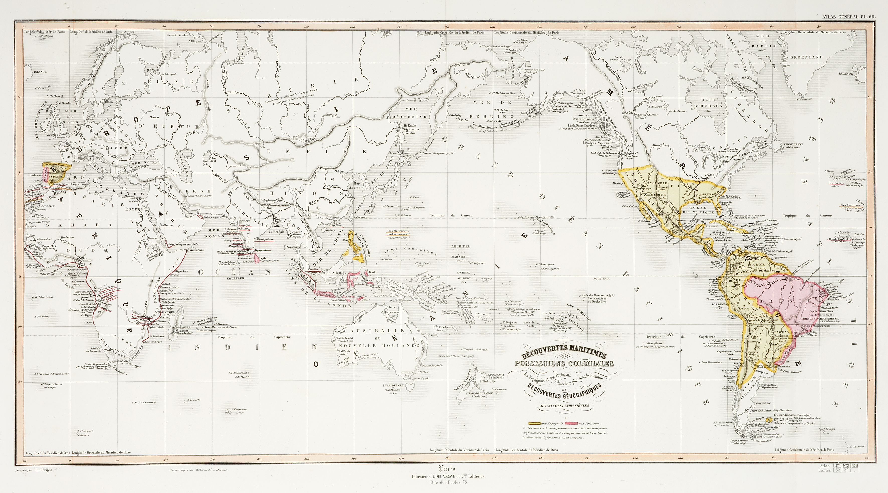 Decouvertes Maritimes Posseddions Coloniales des Espagnols et des Portugais dans leur plus grande etendue et Decouvertes Geographiques Aux XVI, XVII et XVIIIe siecles.