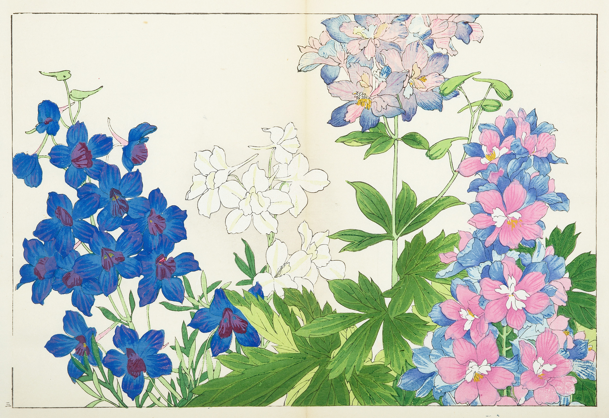 Woodblock of Delphiniums by Tanigami Konan from the series, Seiyo Soka Zofu, or a Pictorial Book of Western Flowers.