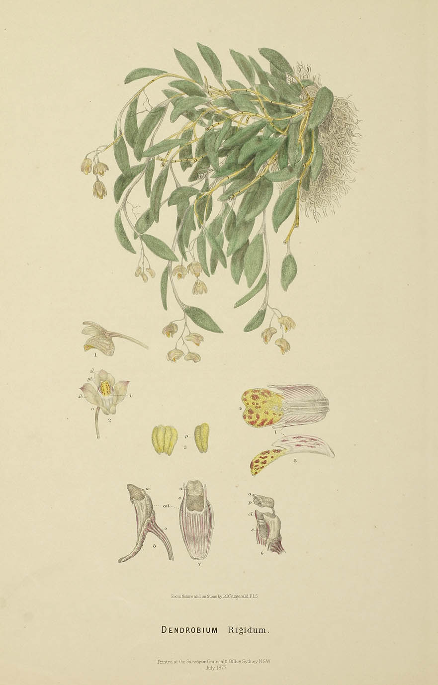 Robert Fitzgerald (1830-1902) Fitzgerald was a surveyor and naturalist, and arrived in Sydney from Ireland in 1856 and soon after was appointed to the Department of Lands as a draftsman for the crown. In his own time Fitzgerald pursued his interest in botany and in 1864 travelled to Wallis Lake, north of Newcastle in New South Wales to collect ferns and orchids which he intended to cultivate around his Hunter's Hill home. This interest in orchids was maintained throughout his life and in 1869, 1871 and 1876 he visited Lord Howe Island to collect further botanical samples. It was during this time that he discovered Dracophyllum fitzgeraldii F. Muell, which was later to be named in his honour. He worked for the Department of Lands and was an enthusiastic field collector, devoting himself especially to the native orchids. The publication of the 'Australian Orchids' was acclaimed throughout the botanical world. J.D. Hooker considered it 'a work which would bring honour to any country and to any botanist', while George Bentham wrote 'thanks to you the Australian Orchidaceae are now better known than those of any country out of Europe'.