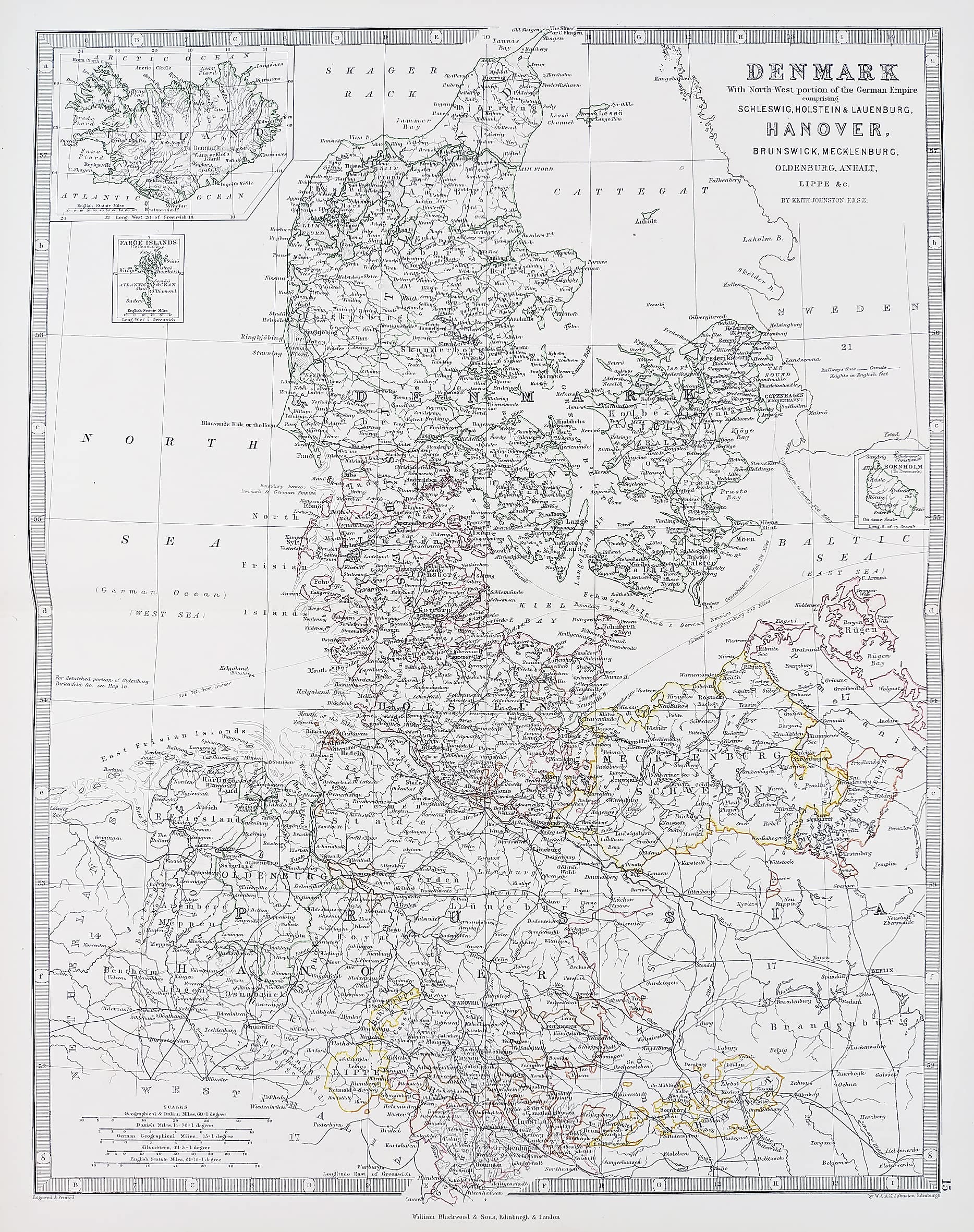 Detailed map of Denmark by Alexander Keith Johnston (1804 – 1871) with two insets of Iceland and Faroe Islands at top left.