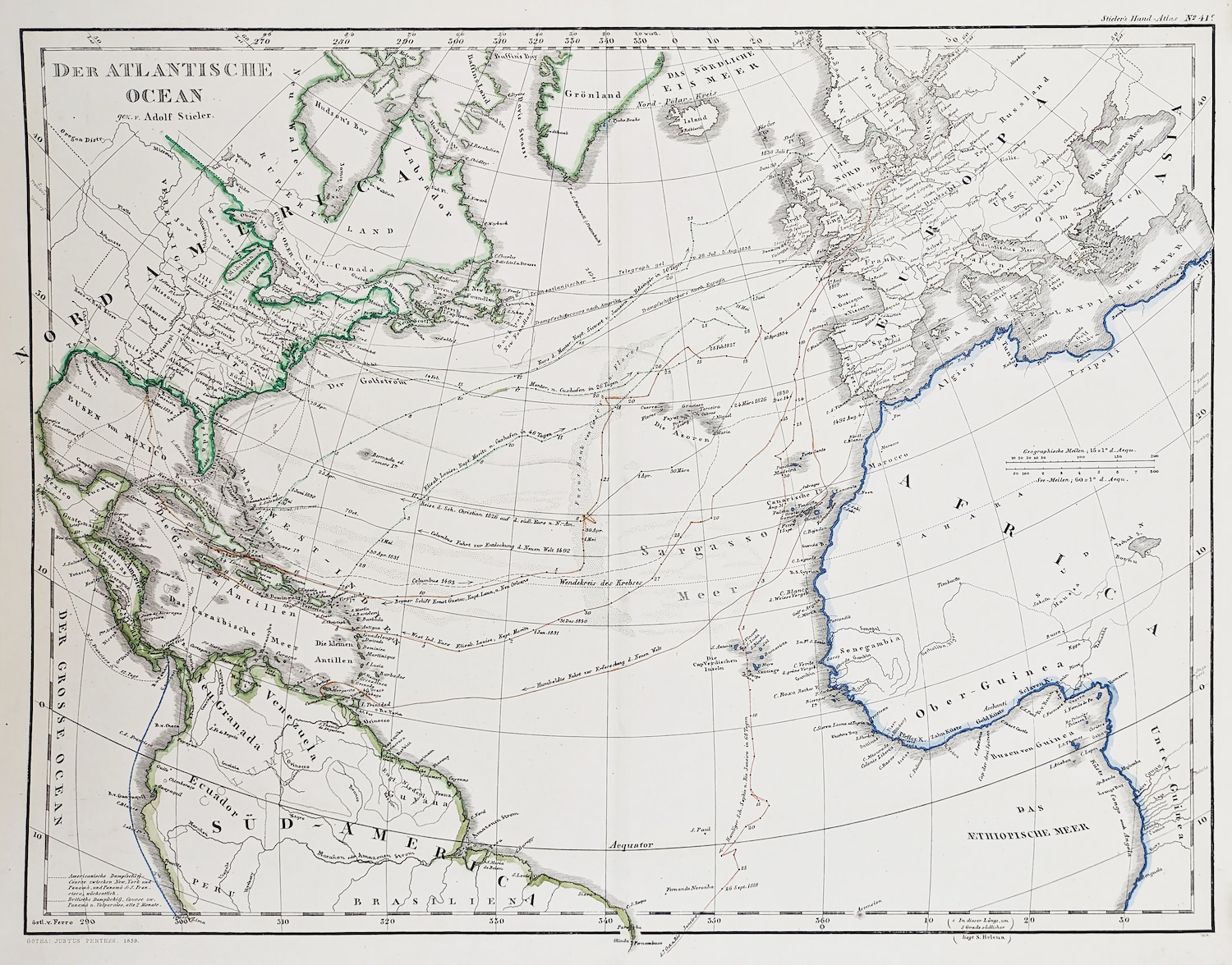 Very detailed German c.19th map of the Atlantic Ocean with explorers routes marked by Adolf Stieler from the 3rd edition of Stielers Handatlas.