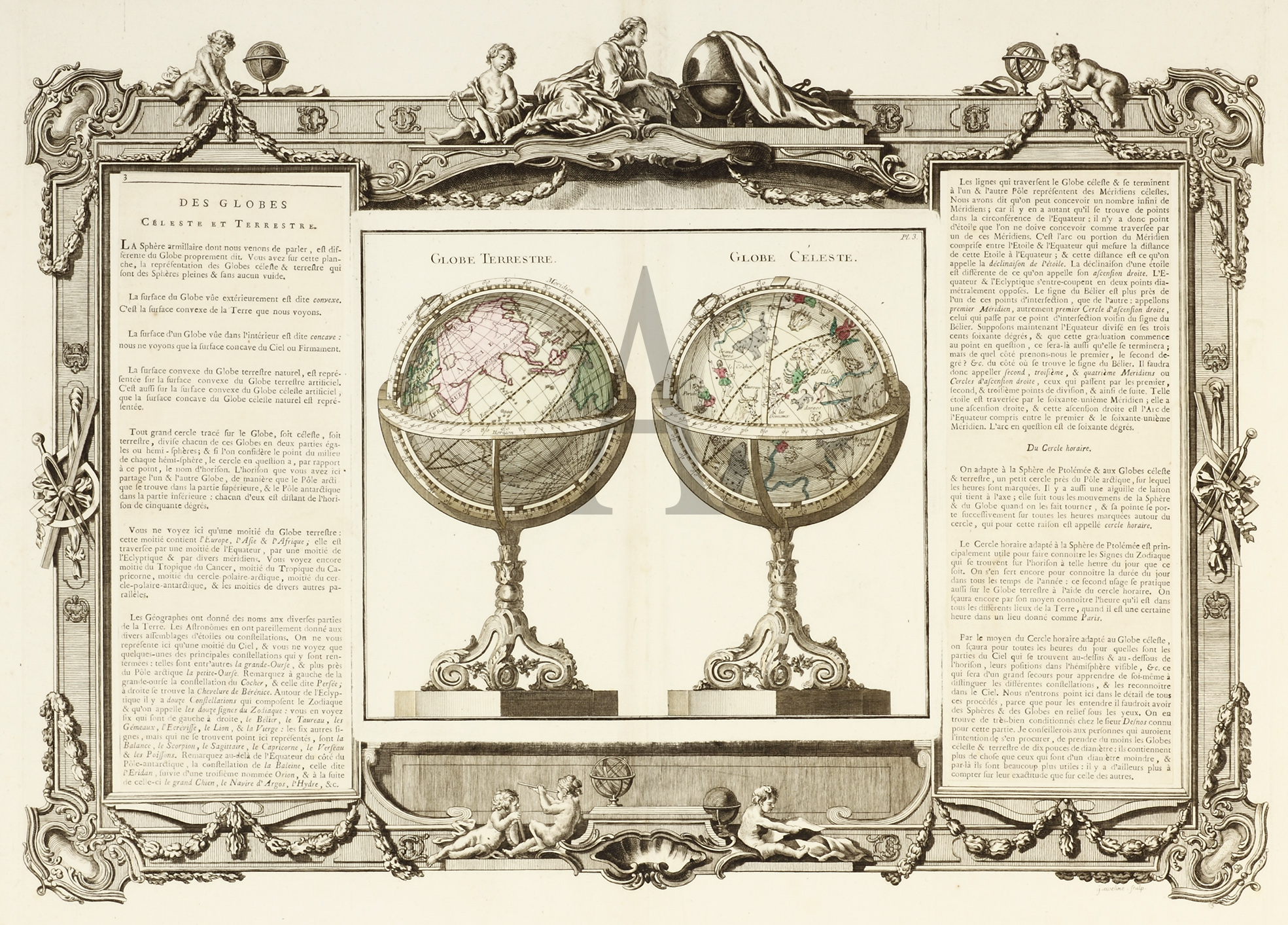 Superb c.18th hand coloured engraved pair of globes, surrounded by a very ornate frame border design with putti and cartographic tools, by Louis Brion De La Tour (fl 1756-1803). On either side are panels of text. Australia is shown joined … Read Full Description