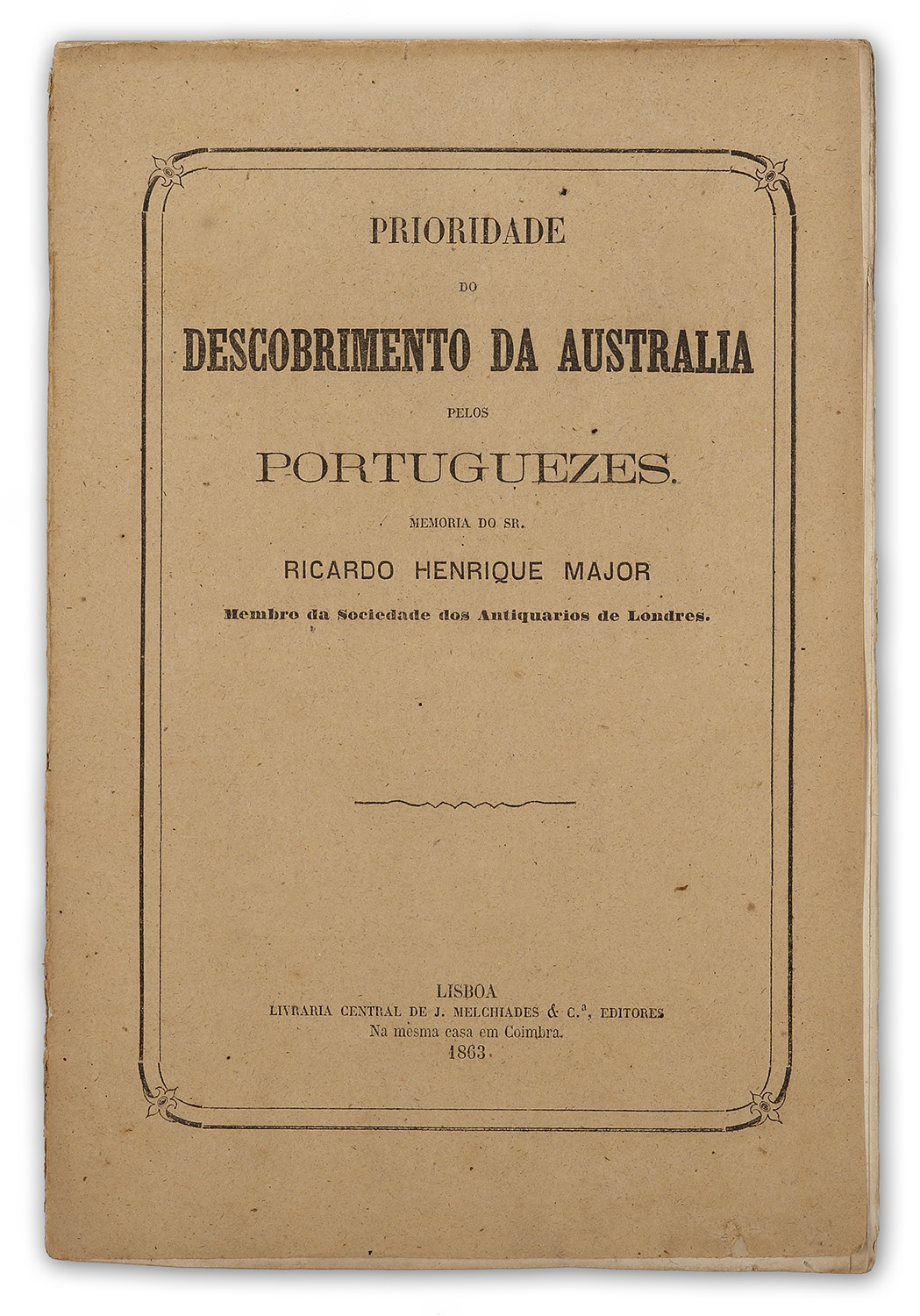 Rare c.19th discourse by Richard Henry Major (1818-1891) of the discovery of Australia by the Portuguese. Soft bound brown wrapper, 24 pp, with the facsimile map of northern Australia from a manuscript chart in the British Library. Major’s publication which was based on his research from the British Library’s rich collection of rare Dieppe maps, manuscripts and journals in the Hakluyt Society created ongoing interest in the subject. He was fluent in Spanish which facilitated his research. This one of two printings made in Lisbon, both in 1863, The other is titled; Descobrimento da Australia pelos Portuguezes em 1601….