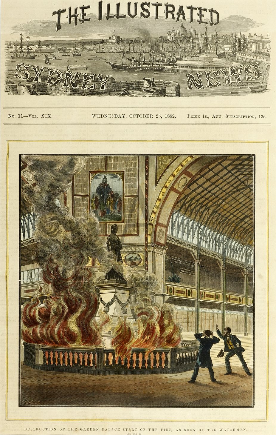 GARDEN PALACE – A rare engraving from the original edition of the Illustrated Sydney News. This is the best contemporary account of the buildings destruction. The Garden Palace designed by James Barnet, built in only eighteen months from iron and timber with the use of electric lights to allow three shifts to work per day. It was a great success with over 1,022,000 visitors through it’s gates. On 22 September 1882 the building was totally destroyed in a six hour fire.