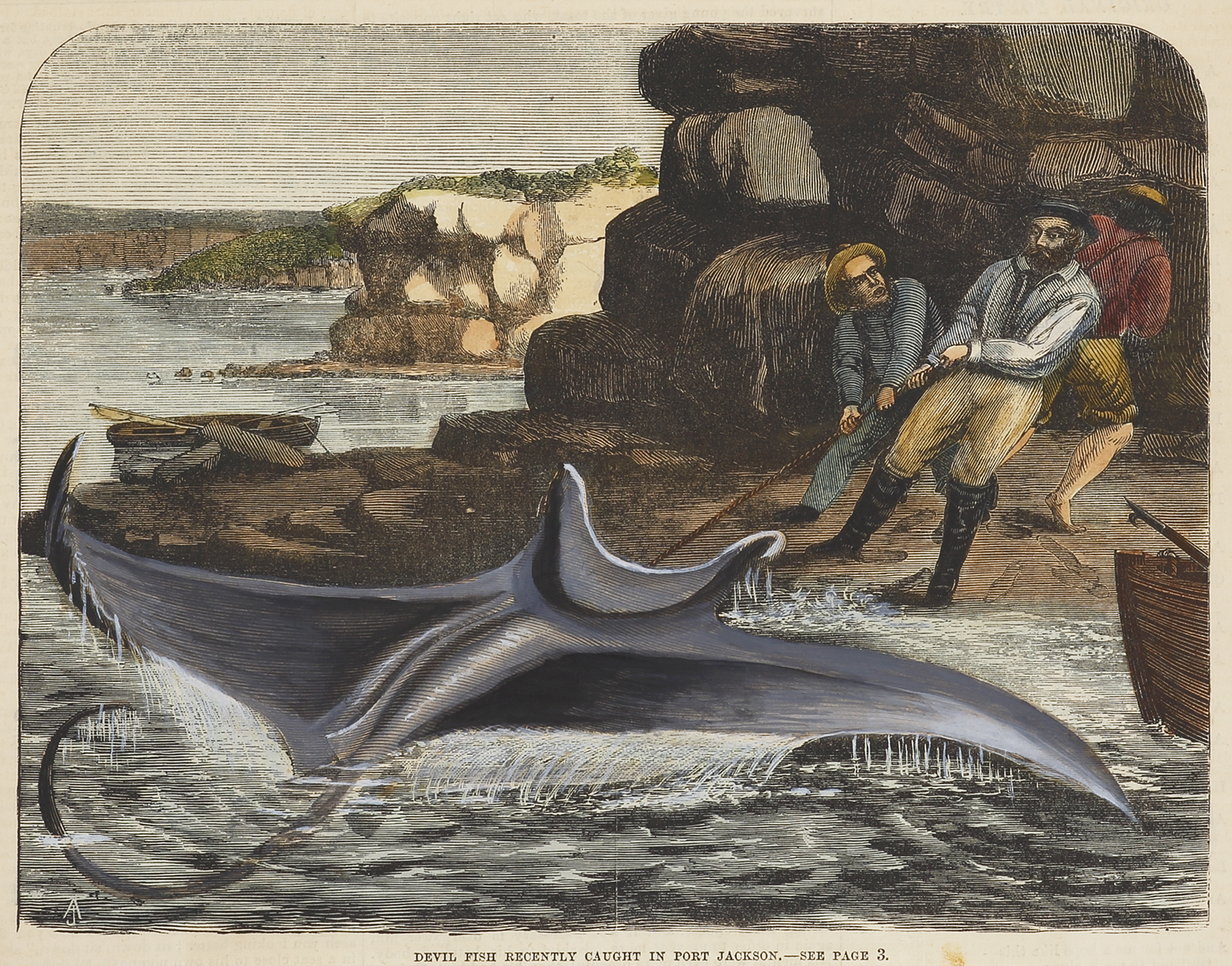 Rare, c.19th hand coloured engraving of three men pulling in a large Devilray in Sydney Harbour. From the original edition of the Illustrated Sydney News. Collections: State Library New South Wales: TN115 State Library Victoria: RARENSL N.S.W. 1875