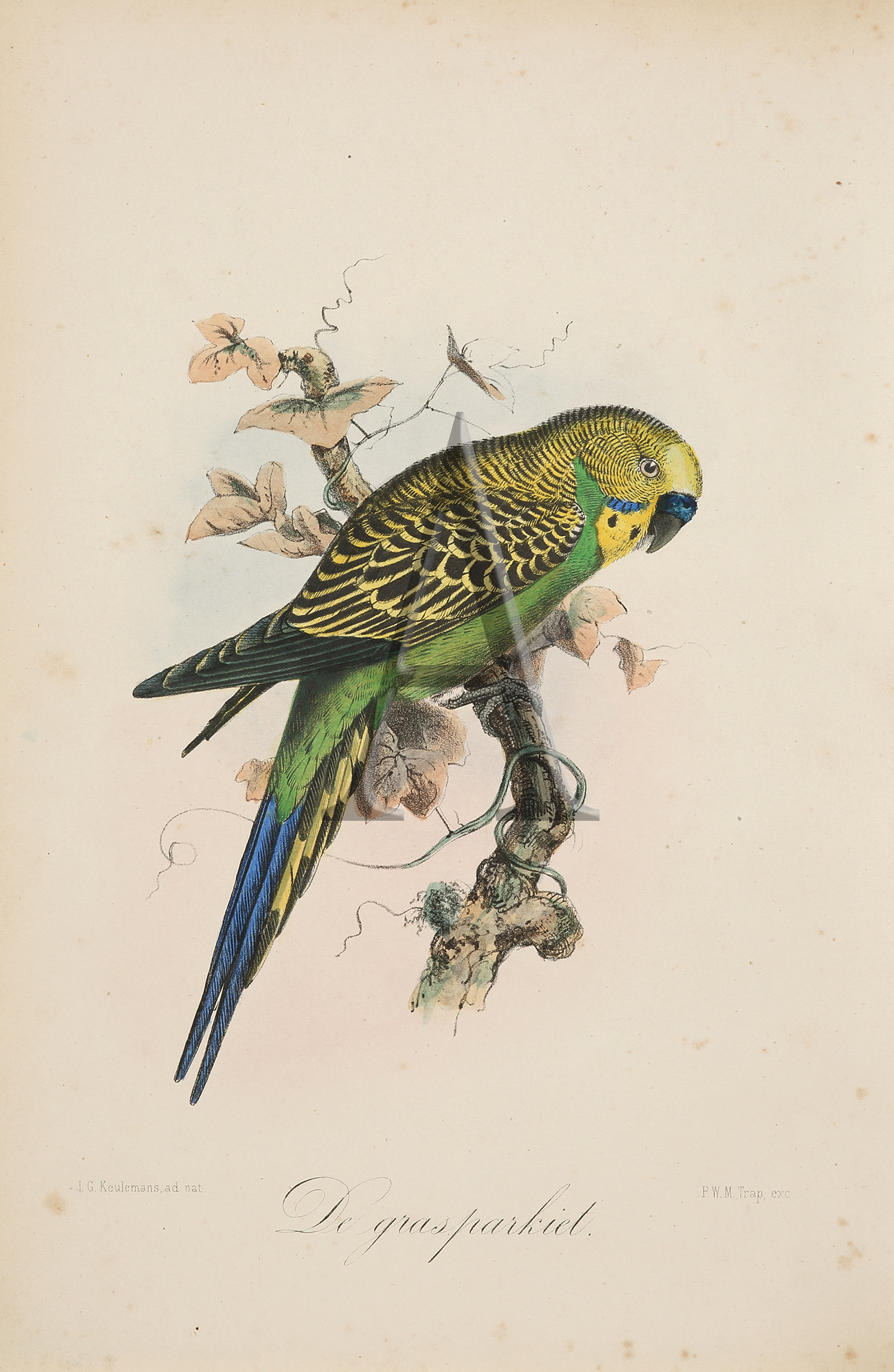 Rare lithograph of the Budgerigar lithographed by the world reknown ornithological artist Keulemans and unusually hand coloured by him.