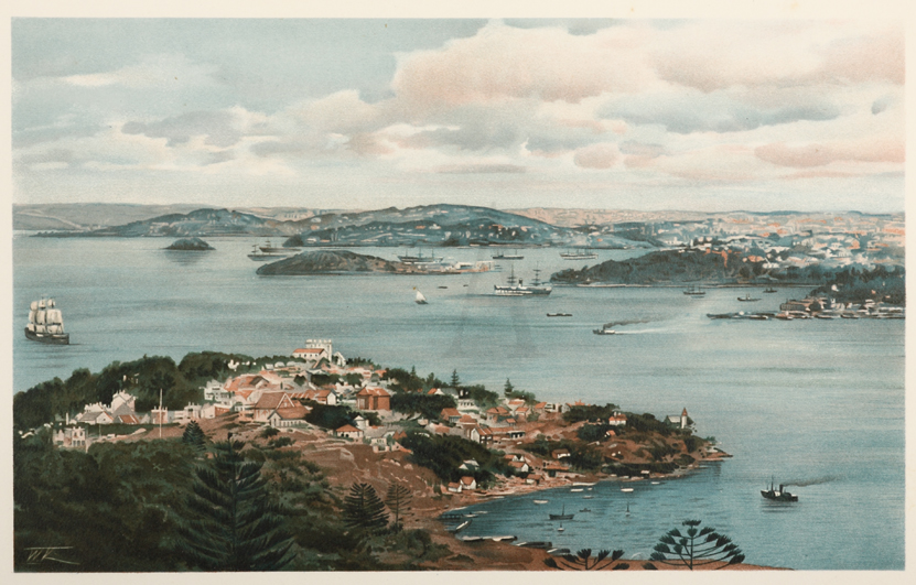 Scarce c.19th colour lithographed view of Sydney from the north shore. The view is probably taken from the Holterman tower looking south east. References: Ferguson, J. A. Bibliography of Australia Volumes 1-8, Canberra 1976 : 15688. Collections: National Library Australia: … Read Full Description