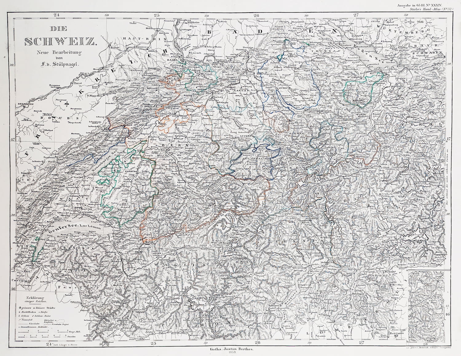 Very detailed German c.19th map of Switzerland from the 3rd edition of Stielers Handatlas.