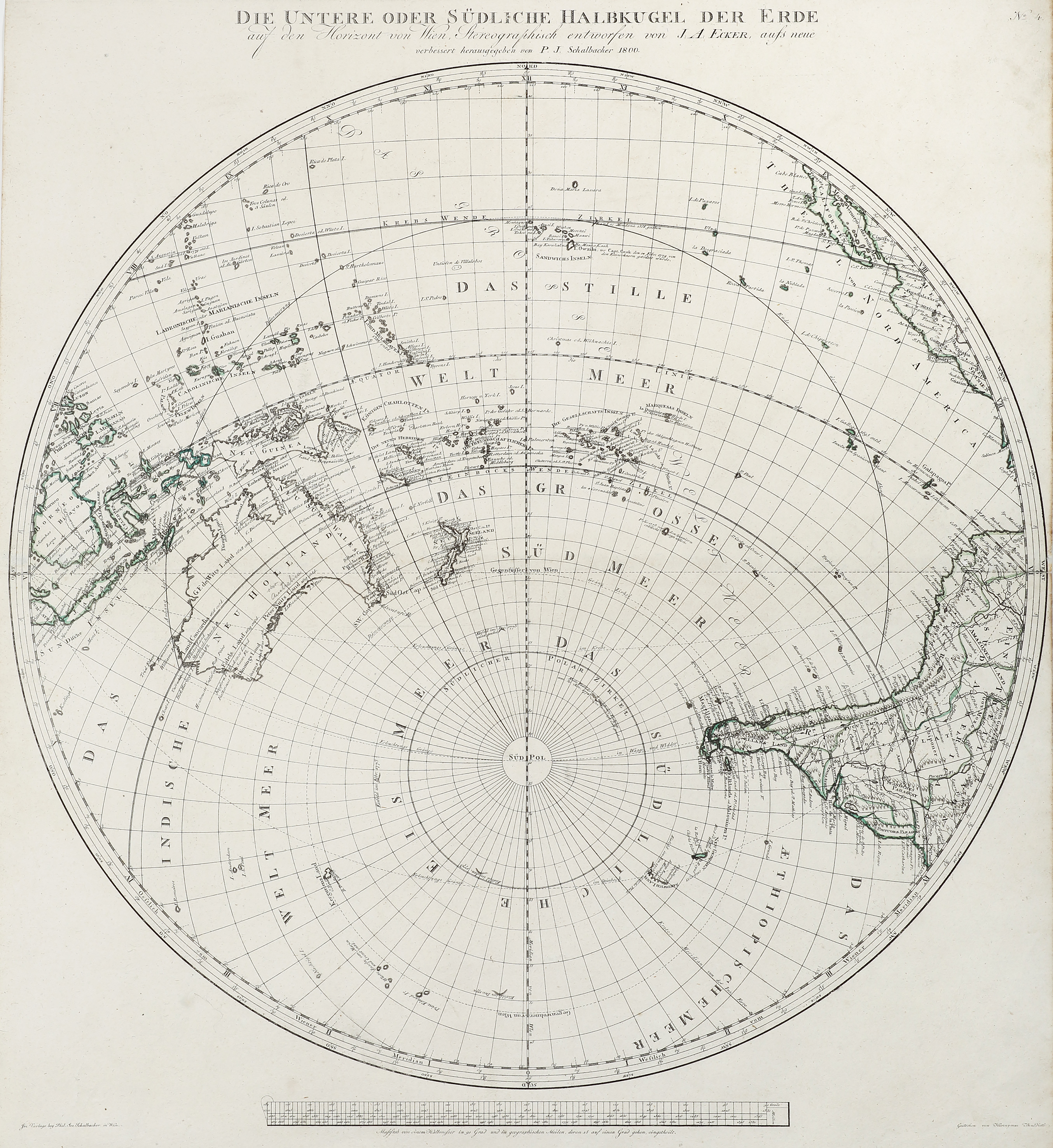 Very detailed early c.19th hand coloured copper engraved map based on the work of Johann Anton Ecker ( 1755 – 1820). Australia is shown with the historical discoveries of the early Dutch, the east coast has Cook’s discoveries. The southern … Read Full Description