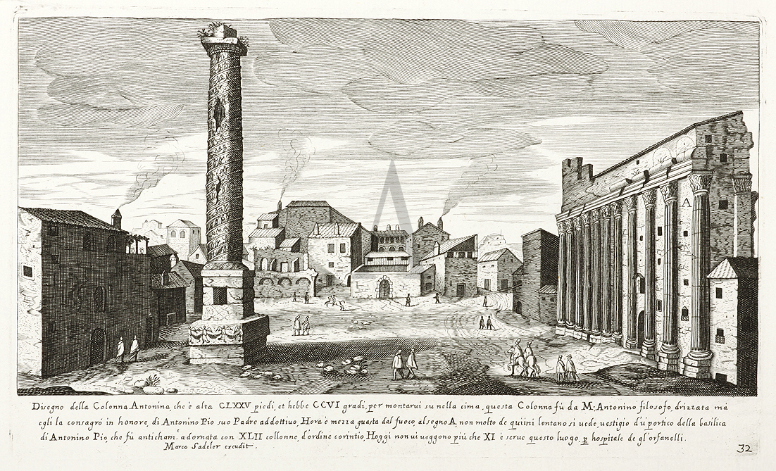 Scarce c.17th engraving is of the Column of Marcus Aurelius, Piazza Colonna, Rome. At the time of the engraving, this column was known as the Column of Antoninus Pius, due to a mistaken inscription.