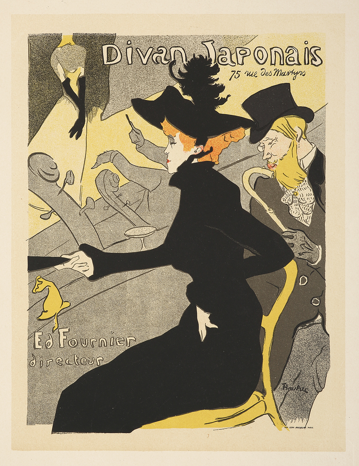 “Of all the female entertainers Lautrec celebrated in his posters, Jane Avril and Yvette Guilbert were the two with whom he maintained the longest friendship. He portrayed them both together in one of his most brilliant posters, Divan Japonais. Although Guilbert was the performer at this rather shabby cabaret when it opened in the spring of (1893), Lautrec made the half-Italian Avril the local figure in his composition. Under a shock of red-orange hair topped with a pagoda-shaped hat and towering plume, her black, silhouetted figure dominates the frontal plane as she nor her companion, Edouard Dujardin, the distinguished founder of the Symbolist Revue Wagnerienne, deign to look at Guilbert on stage, whom Lautrec portrayed as ‘headless’, probably as a witty response to her complaint that he caricatured her and made her ugly”.