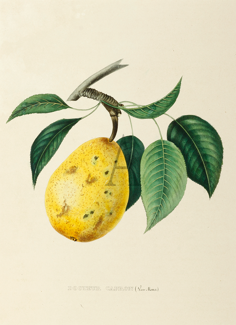 This fine, hand-colored lithograph is from the rare work entitled Annales de Pomologie Belge et Etrangere [Annals of Belgian and Foreign Pomology]. The well-known Alexandre Bivort authored this work along with Lauren Seraph and Joseph de Bavay. It was published in Brussels by F. Parent in 1857 by the Royal Commission of the Pomological Institute by the Belgian King. The work contained over 300 plates of various fruits that were cultivated predominantly in Belgium but included fruits from all over Europe. The work set standards in its time as a reference for other later pomological works.