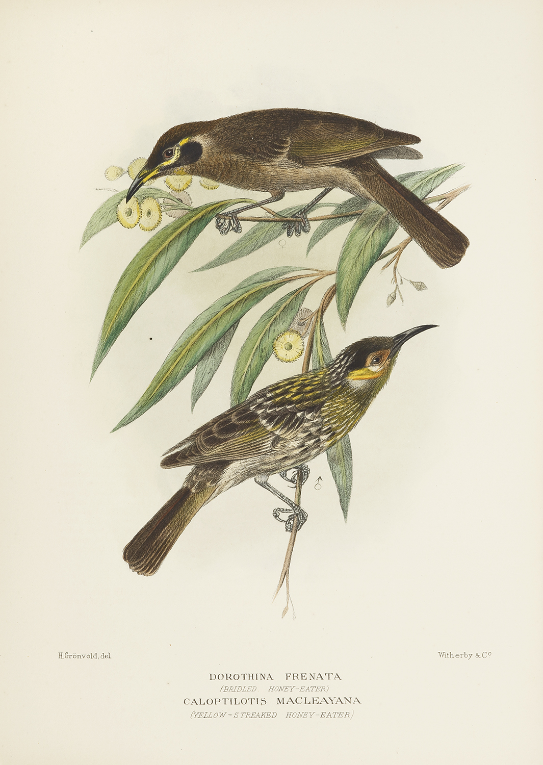 Superb lithograph with original hand colouring, of the Bridled Honey-eater and Macleay’s honeyeater from the last great series on Australian ornithology, The Birds of Australia by G. Matthew’s.