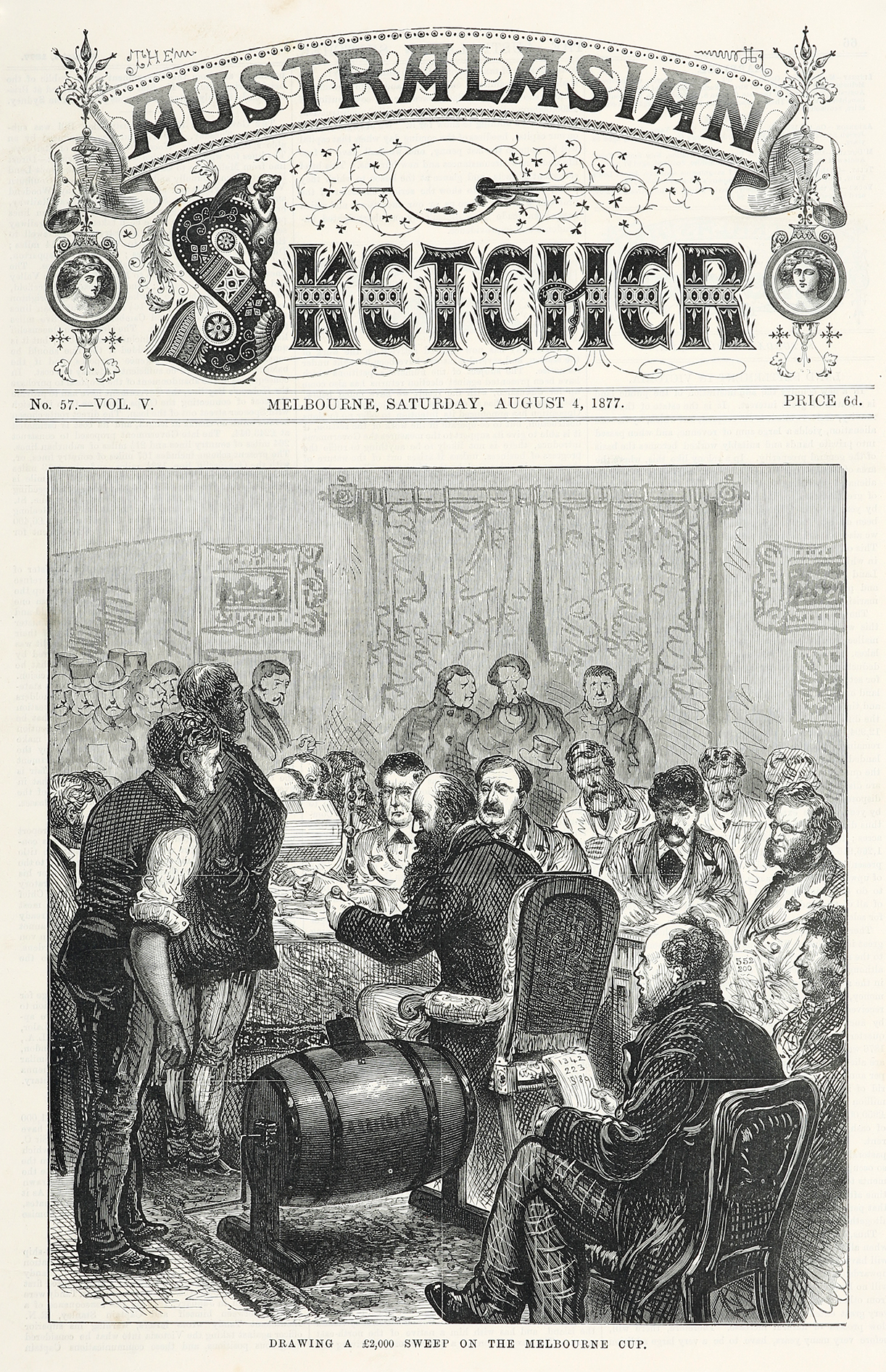 Scarce c.19th engraving showing the drawing of the 1877 Melbourne Cup sweep. From the original edition of the Australasian Sketcher. Collections: National Library Australia: Bib ID 914558 State Library New South Wales: REF1/MAV/FM4/9236-9239 State Library Victoria: PCINF AS 06-09-73 P.104