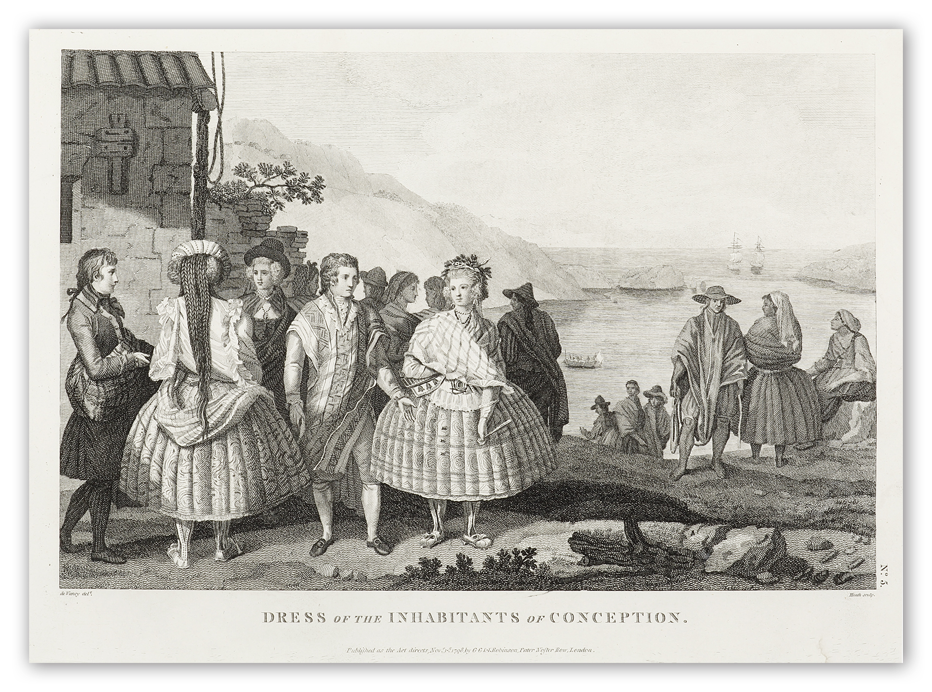 C18thengraving of the people of Conception on the Biobio River, Chili from, Charts and Plates to La Perouse’s Voyage.