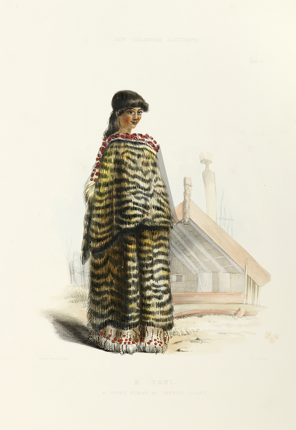 “The portrait shows the manner in which the hair is usually worn over the forhead by the unmarried girls of New Zealand. The dress consists of a magnificent Kalahu of strings of rolled flax,dyed at alternate intervals,and bordered at the … Read Full Description