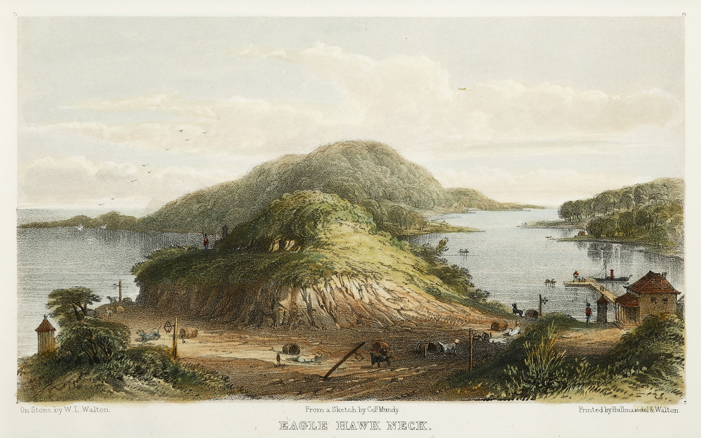 Scarce c.19th hand coloured lithographed view of Eaglehawk Neck, the narrow isthmus at the top of the Tasman Peninsula.