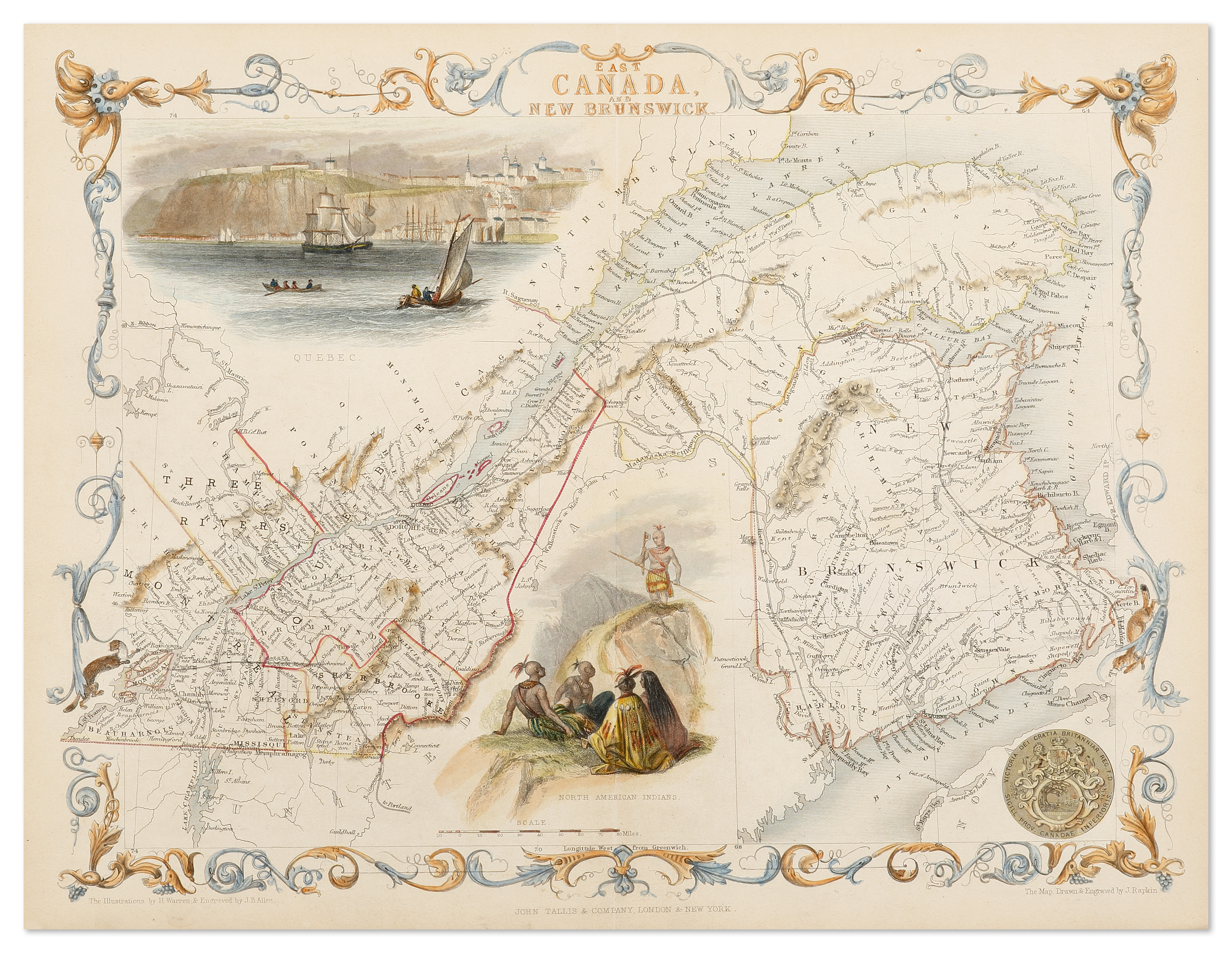 Superb fully hand coloured example of one the most decorative c.19th maps of Canada, from The Illustrated Atlas by John Tallis. With decorative border surrounds and vignettes views of Quebec and North American Indians.