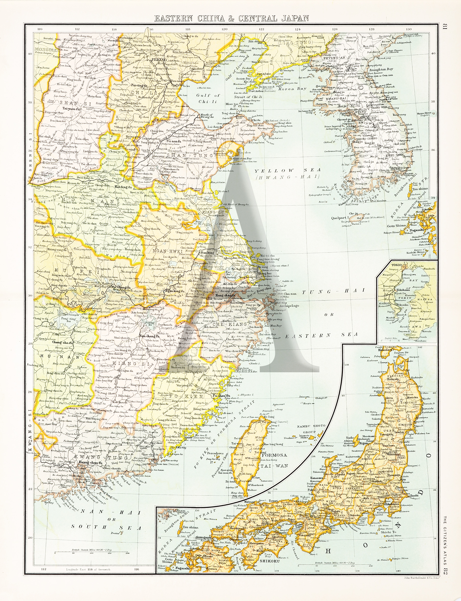 Detailed early c.20th map of China, Japan, Korea and Taiwan, by the important Scottish map publishers, John Bartholomew and Sons, Edinburgh. There are two inset plans at lower right of: Tokyo, Honshu Collections: National Library Australia: Bib ID 2532586 University … Read Full Description