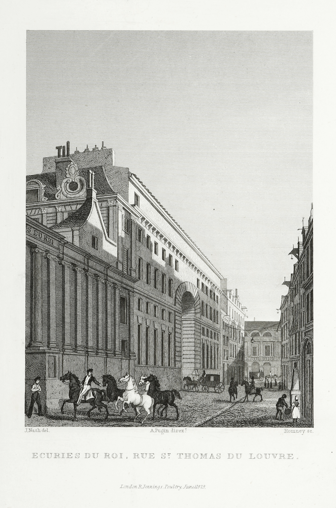C19th engraving of the King’s stables at St. Thomas du Louvre, in France.
