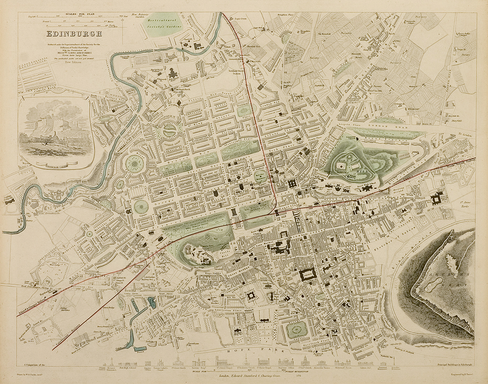 Detailed plan of Edinburgh with engraved elevations of prominent bulding along the lower section of the map. Inset views of Edinburgh Castle. Published by the Society for the Diffusion of Useful Knowledge.