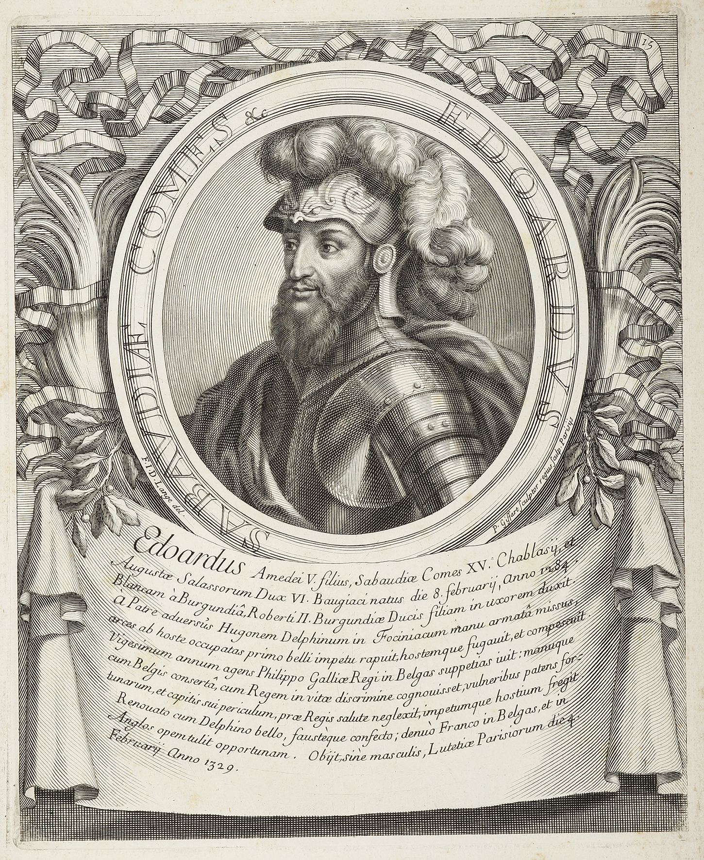 Fabulous engraved portrait of Edward (1284–1329), surnamed the Liberal, Count of Savoy from 1323 to 1329. He was the son of Amadeus V, Count of Savoy, and his first wife Sybille of Bâgé.