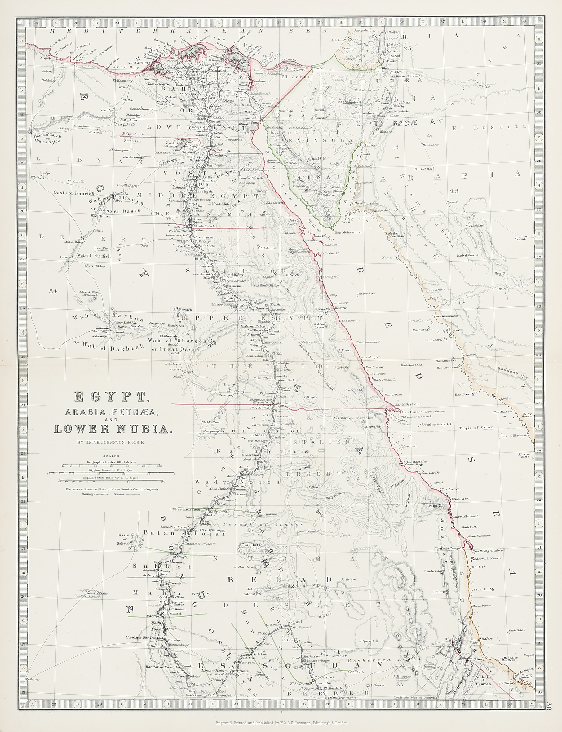 Detailed, large scale c.19th map of Egypt to the Sudan and Sinai, part of Syria and Arabia by Alexander Keith Johnston (1804 – 1871).
