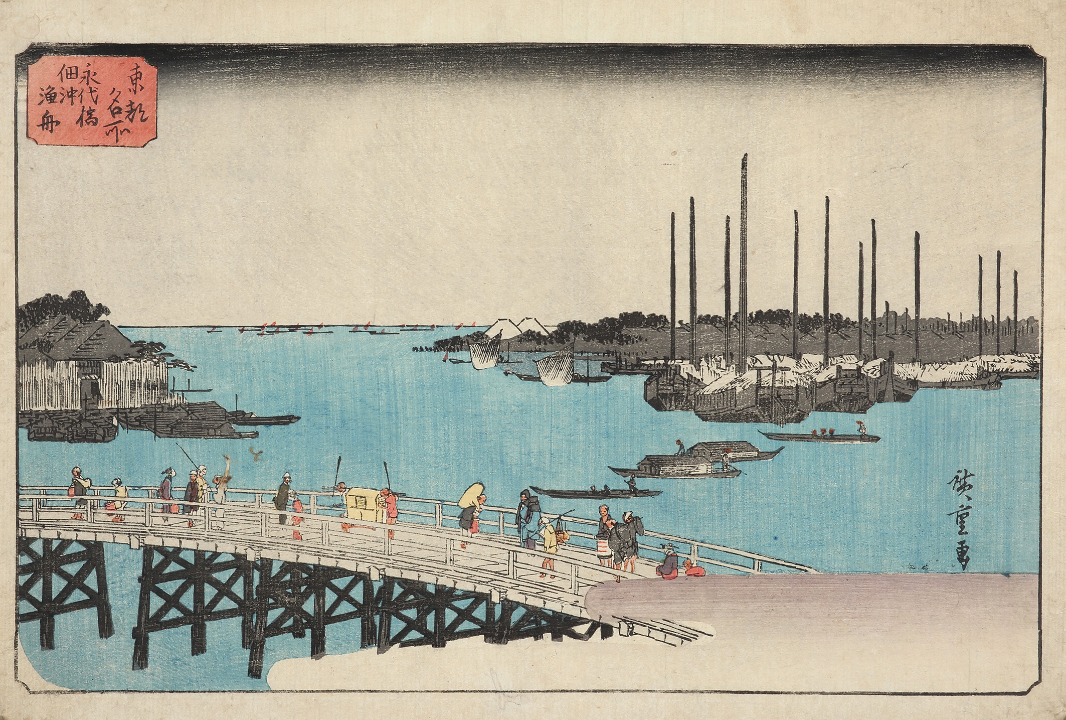 Scarce c.19th colour woodblock by Utagawa Hiroshige (1797-1858), of fishing boats near Eitai Bridge in Tsukuda Bay.