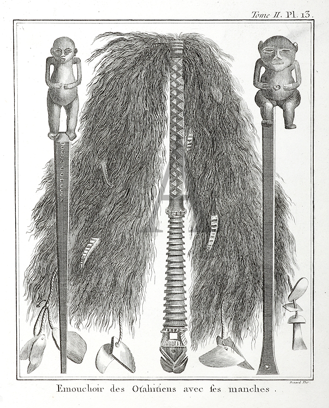 Rare engraving from the French edition of the accounts of Cook’s first voyage. A fly whisk with ‘Janus’ figures on the handles from Rurutu one of the Austral Islands, Windward Islands part of the Society Islands. Situated 570kms from Tahiti. … Read Full Description