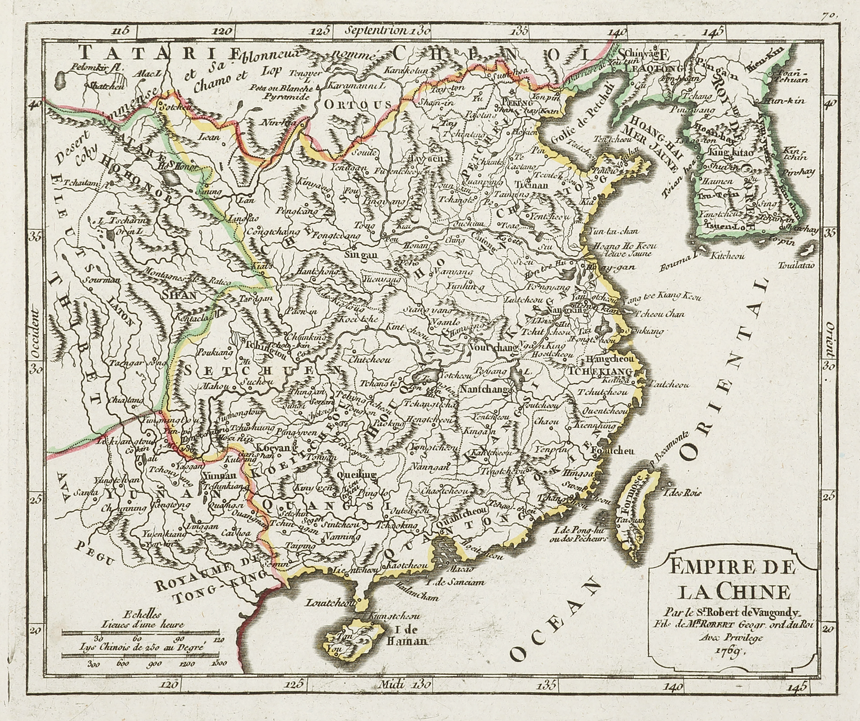 Scarce c.18th French hand coloured engraved map of China by Robert de Vaugondy (1688-1766). From: Rovert de Vaugondy, Atlas portatif, universel. Composé d’après les meilleures cartes, tant gravées que manuscrites, des plus célèbres géographes et ingénieurs. Paris