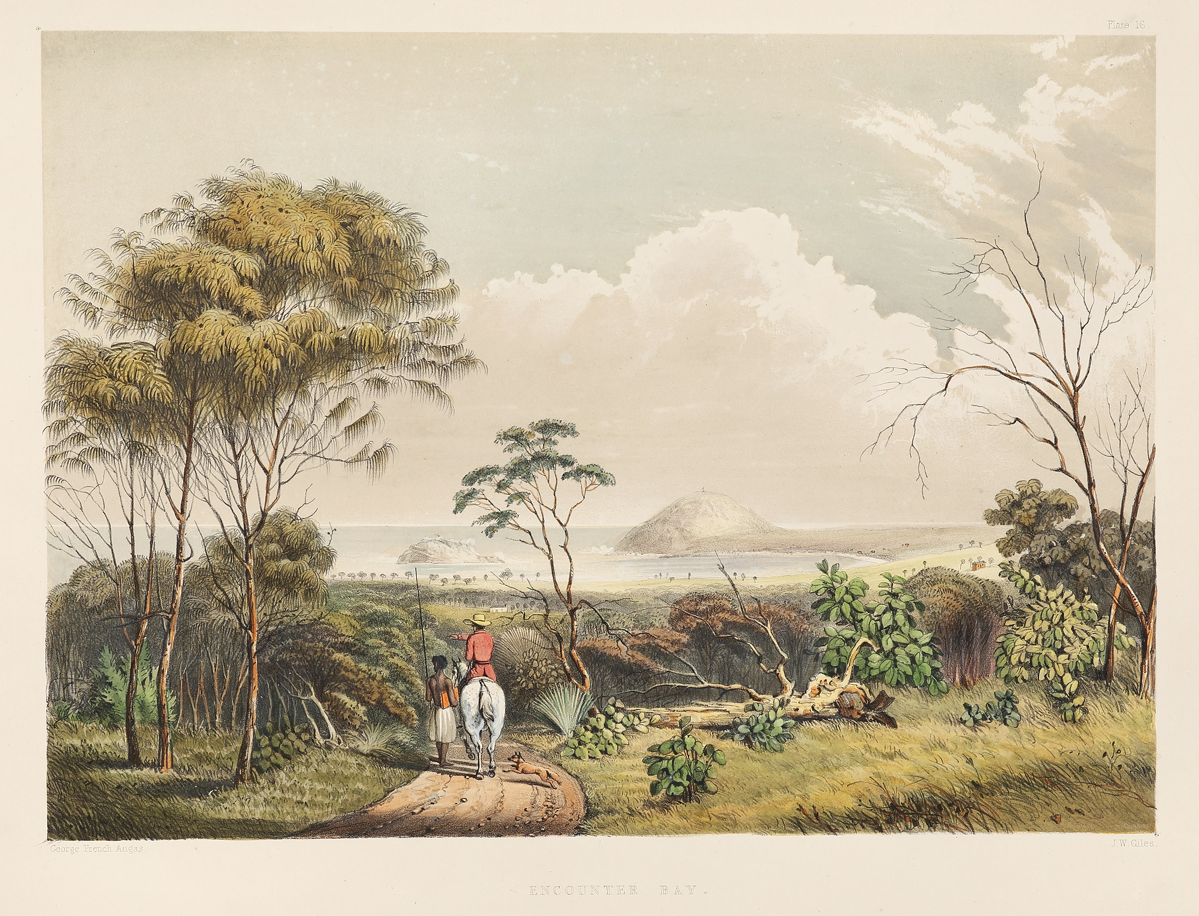 Angas made this image on his tour of Fleurieu Peninsular in MArch 1844. He depicts the view which suddenly strikes the traveller descending from the hills along the Inman Valley road. The South Australian Company established a whaling station at Encounter Bay very soon after settlement in 1836 and whaling was actively carried on by the Company’s successors in 1844. The flag pole used for signalling the arrival of whales can be seen on the summit of Rosetta Head, a singular outcrop of granite named after the artist’s eldest sister. The figure on horseback is probably intended to represent the artist himself, accompanied by an Aboriginal carrying his portfolio of sketches. (Tregenza p.36)