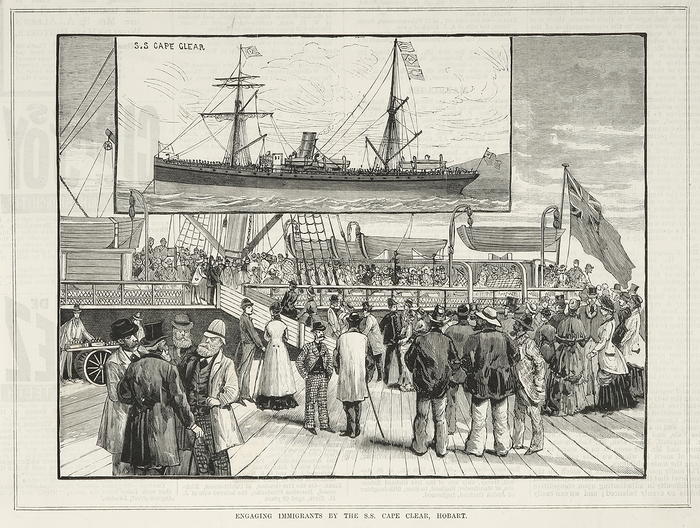 Scarce colonial engraving of immigrants arriving at Hobart on the S.S. Clear who had sailed from London 25th August and arrived 26th October.