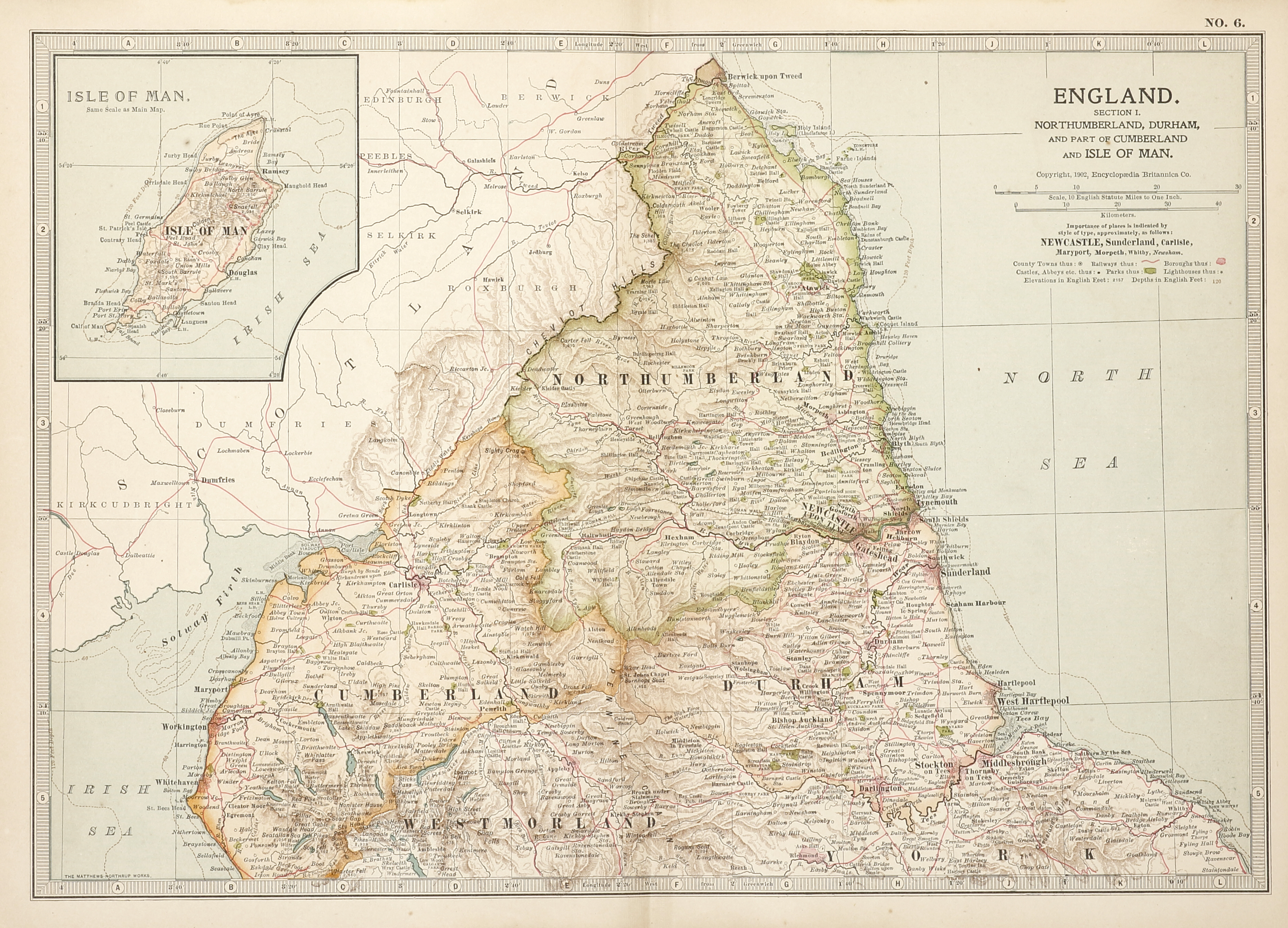 Detailed early c.20th map of northern England with an inset of the Isle of Man at top left.