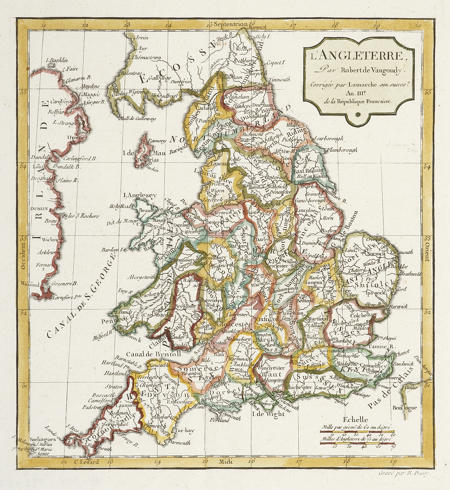 French c.18th map of England divided into counties by Gilles Robert de Vaugondy (1688 – 1766).