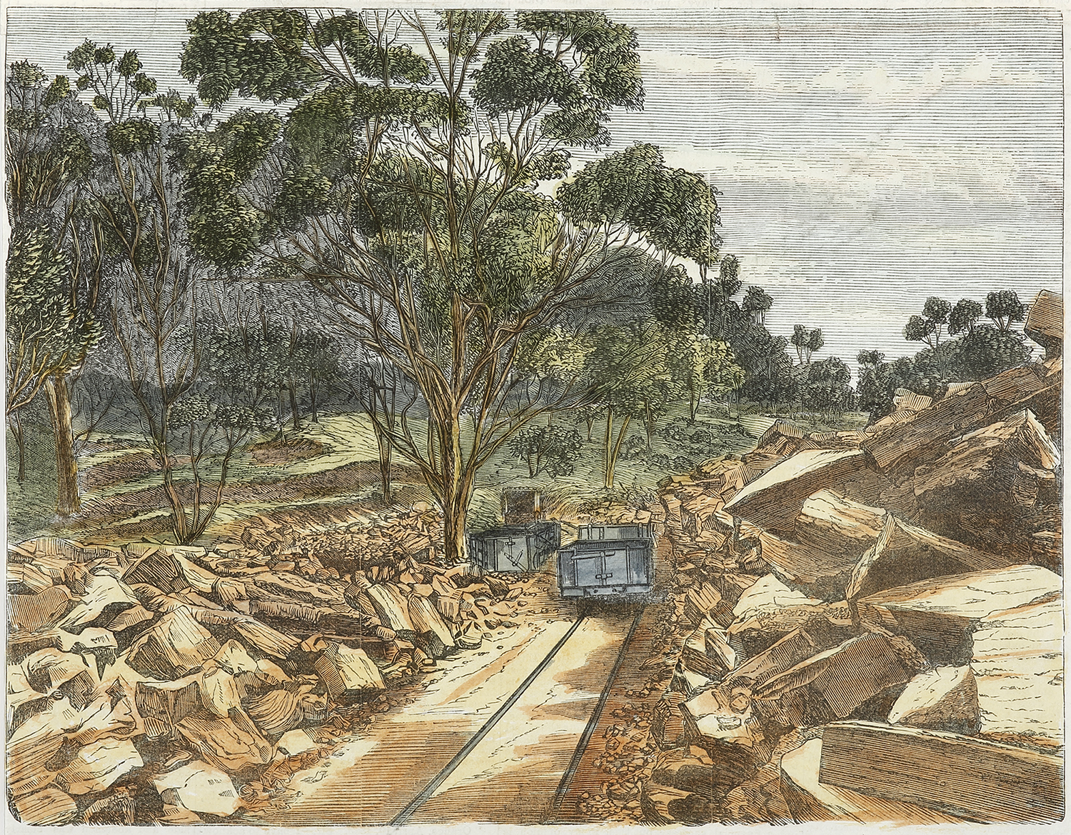 Rare c.19th hand coloured engraving of the shale mine at Hartley Vale.