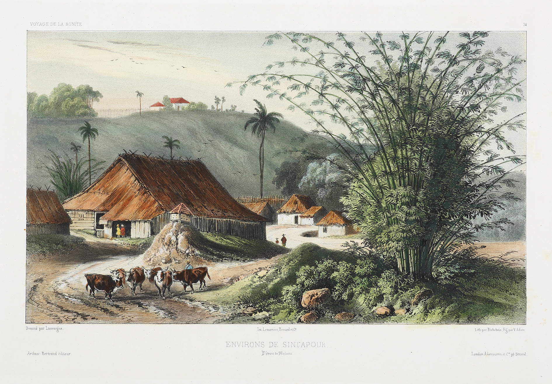 Rare c.19th aquatint of Singapore, depicting a wooden house with an attap roof in a Malay village at the foot of Mount Faber, by Barthelemy Lauvergne ( 1804 – 1871), from the official accounts of the voyage of the French corvette La Bonite, under the command of Auguste-Nicholas Vaillant.