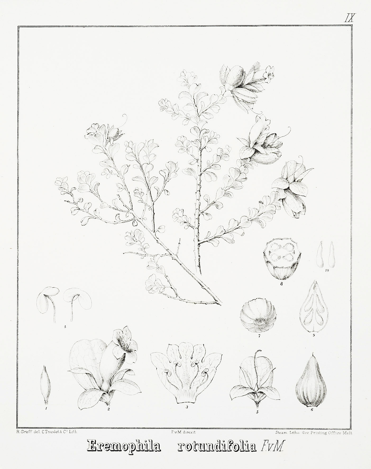 Scarce c.19th lithograph of the Round-Leaf Emu bush from Ferdinand von Mueller’s, Description and illustrations of the Myoporinous plants of Australia. Modern binomial name: Eremophila rotundifolia First described: von Mueller, 1859 Distribution: SA