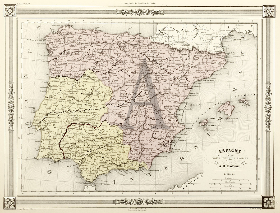 Decorative map with frame border, showing Spain during the Roman period.